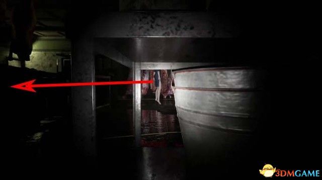 原路返回觸發女鬼追你的劇情,往回跑的時候,和如下圖箭頭所指的捲簾門互動,進去,