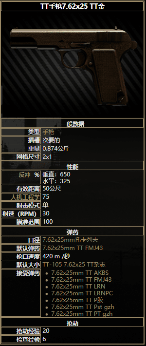 傳說中的手槍。它已經發生了無數次軍事衝突,並且仍在我們星球的某些地點(一種或多種修改)服役。這是經典的TT-33,是量產最多的版本。它具有勃朗寧短反沖傾斜式槍管系統,但有很大的不同-有目的的簡單,單動,除了半公雞式缺口之外沒有其他安全措施,它能夠承受可怕的操作濫用。得益於強大的7.62×25彈藥筒和相對較長的槍管,TT的槍口速度,穿透力和精確度都很高,即使在很長的距離上也是如此。