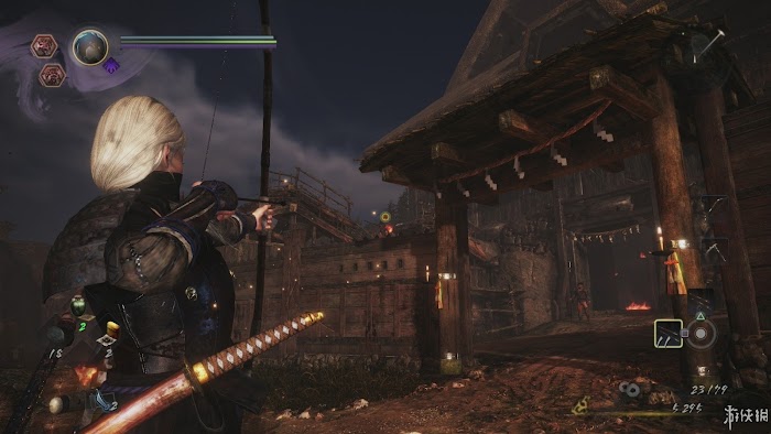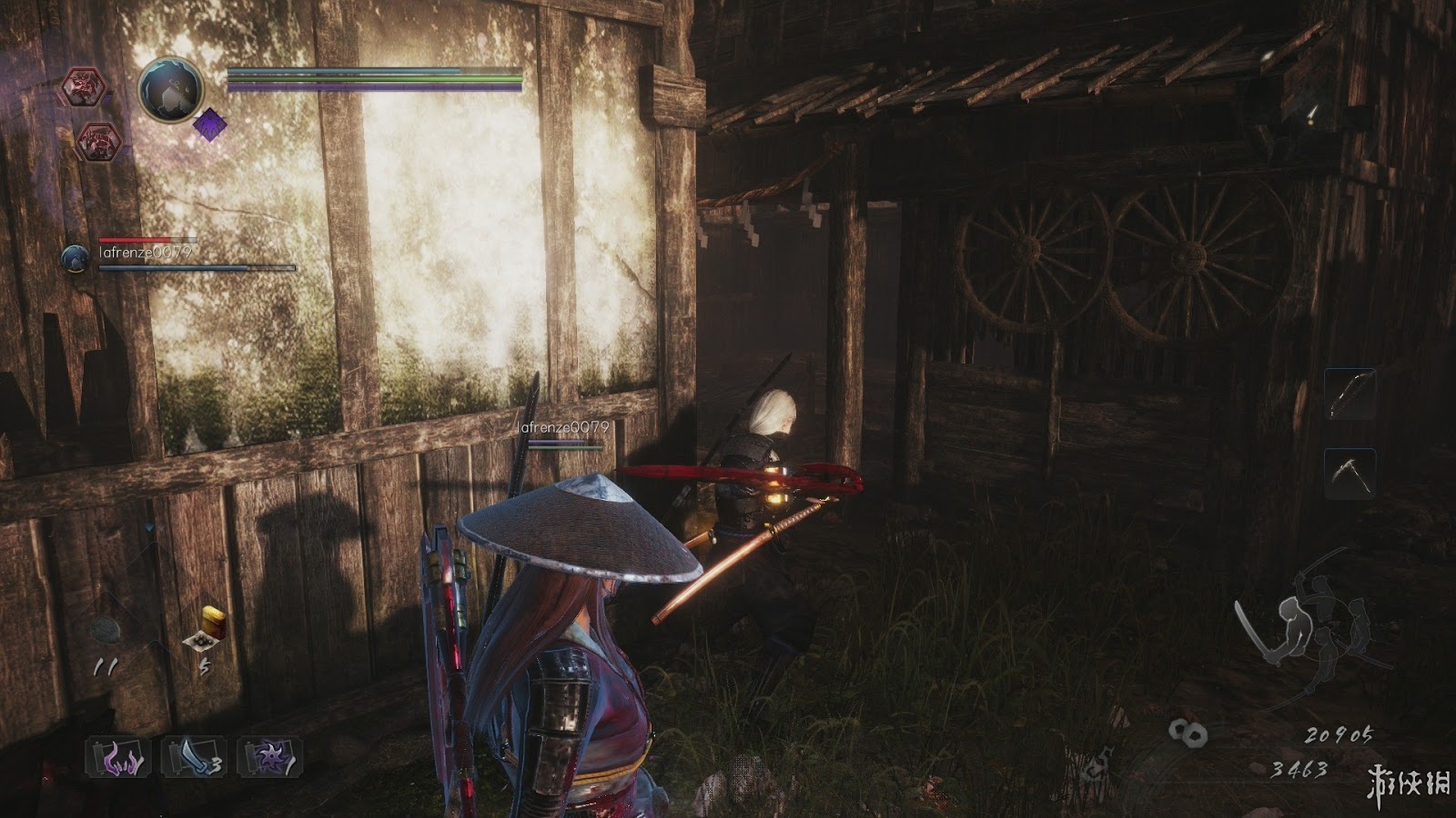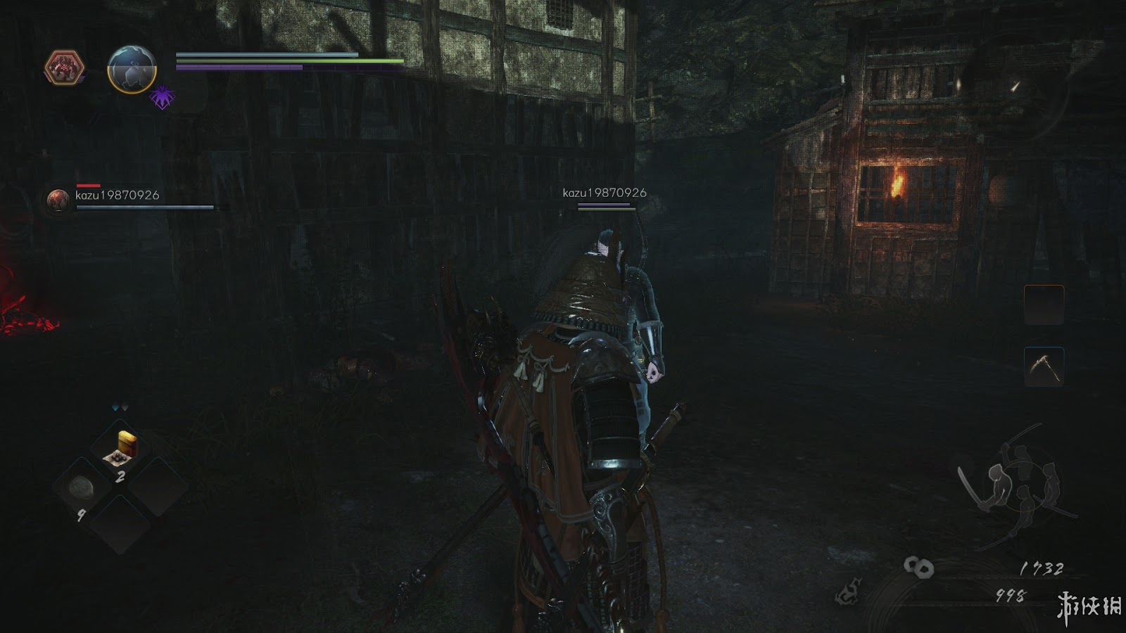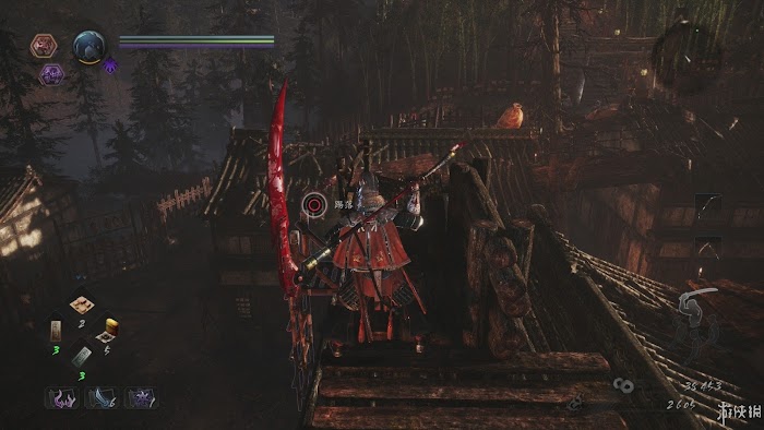 前面的岔路口有餓鬼在中間,左側的樓頂上還有一隻妖鬼會跳下來加入戰鬥,建議先在遠處用石頭或者弓箭將餓鬼先解決在對付妖鬼。