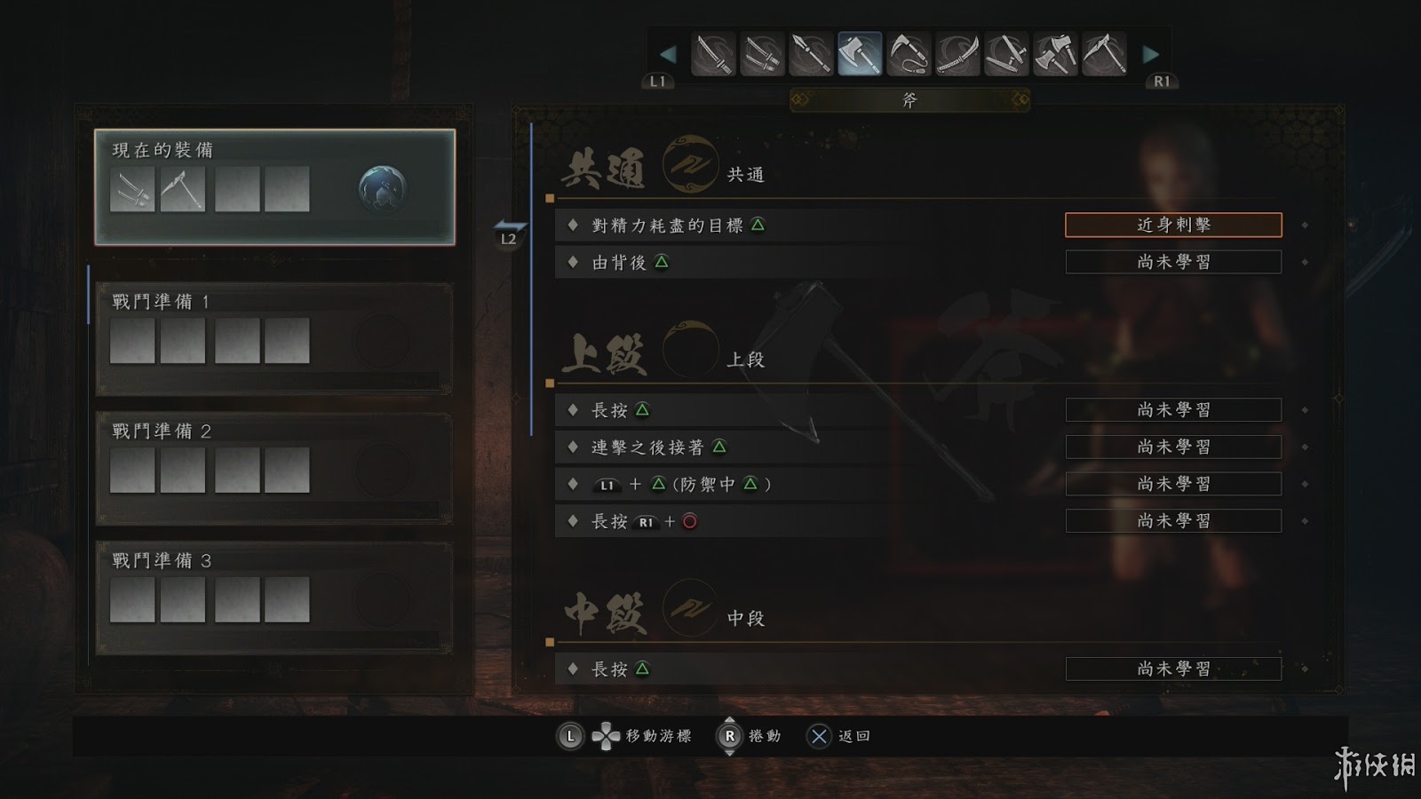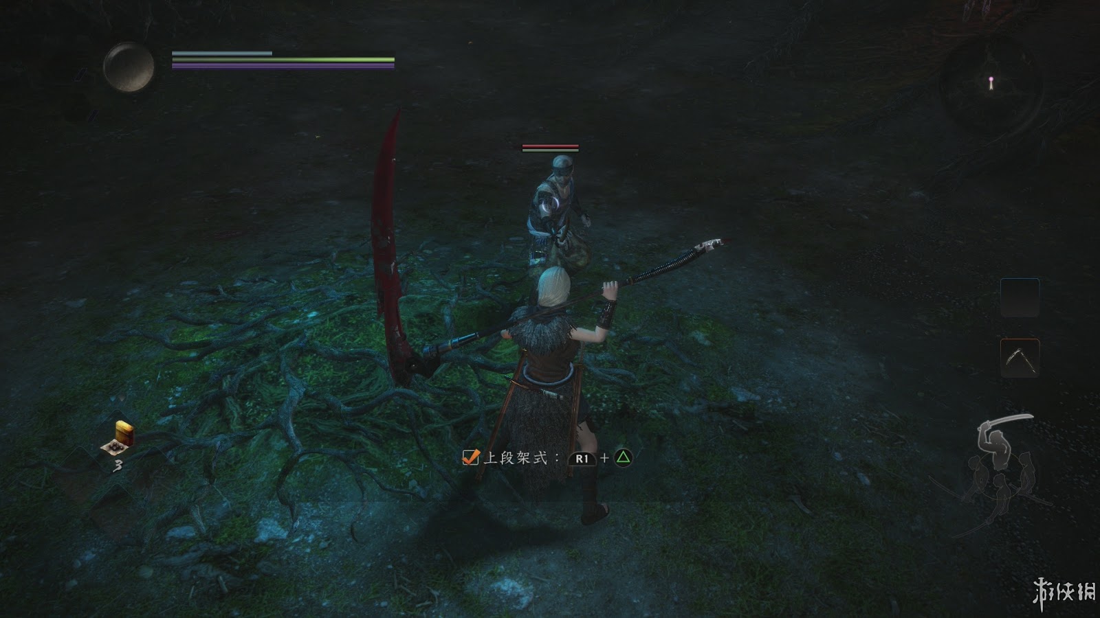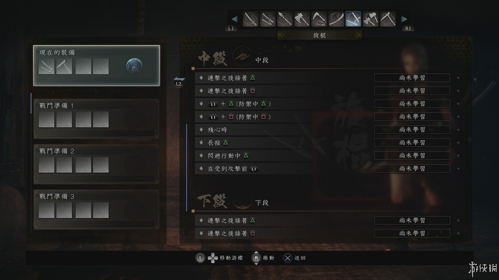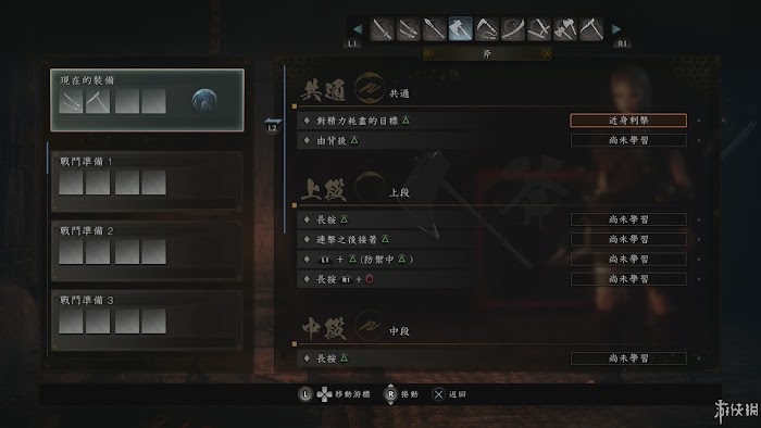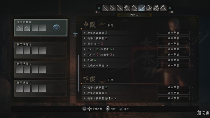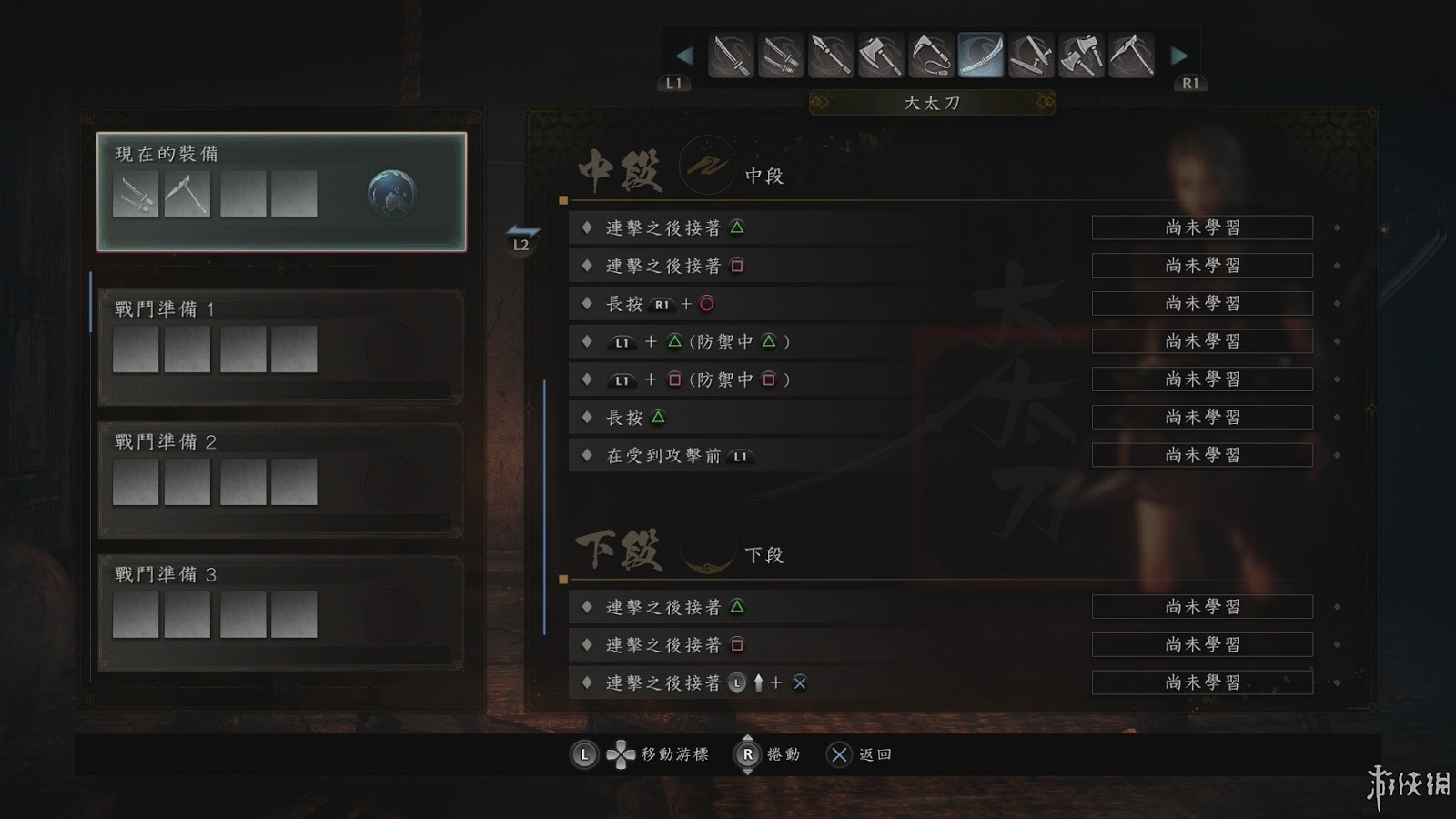 下段架勢:按住R1後按下×,該架勢以閃避見長,精力消耗較少並且動作破綻也較小。