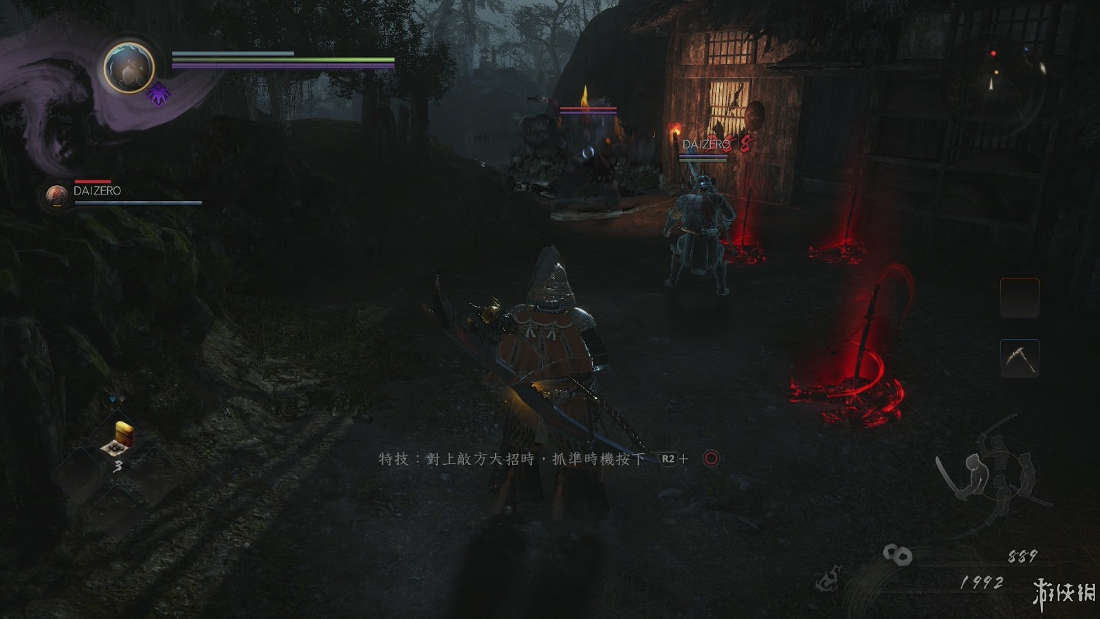 大招與特效:按下R2+○發動並消耗妖力1,可以暫時化身為妖怪釋放強攻擊,成功擊潰敵方大招時能夠給予大量精力傷害。