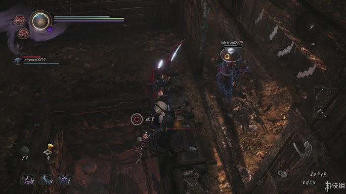 繼續前進會看到左側有一隻猿鬼,先進入右側的屋子裡從梯子前往地下道。