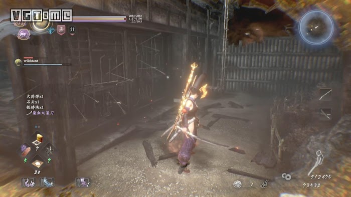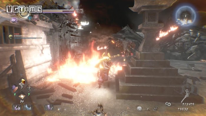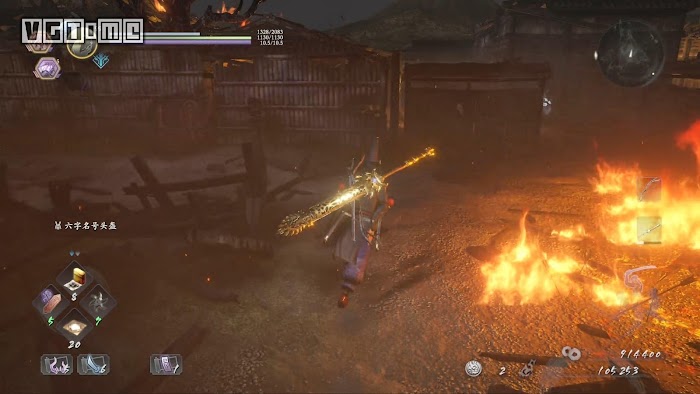 到另一邊之後,可以先從左邊繞到第一個神社旁邊鎖著的門,打通近路。下圖位置前方第二個房子裡有藍色火擋住出口,這裡現在別趟火硬闖,基本扛不住就燒死了。正確路線是打開神社大門之後貼著左邊直走,從一個廢墟木板跳下,能看到下一個區域中有一個藍色輪入道以及大量藍色火焰,這是正確的路線。擊殺藍色輪入道就能讓該場景中所有藍色火焰消失。