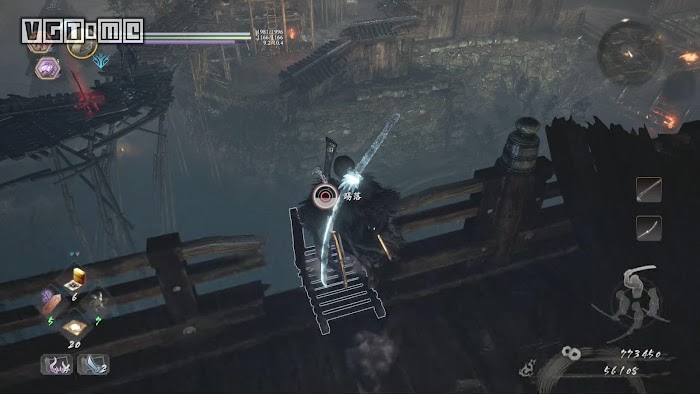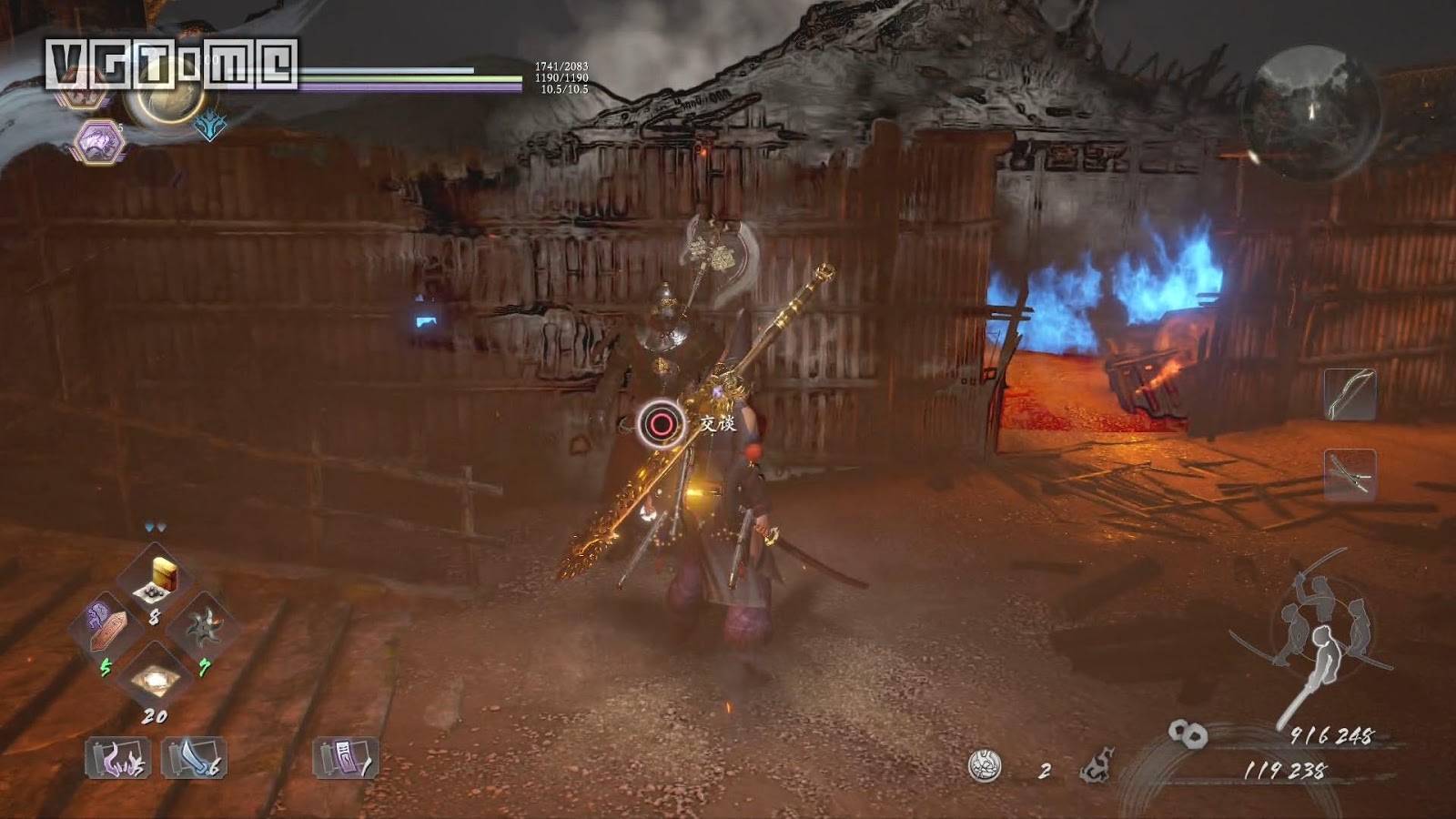 離開田地,不用過橋進入前方軍營,直接從橋上跳下來,前往右前方的山洞。進入山洞左轉會看到泥牆,從它的位置進去往右看能看到藍色紅色兩種水晶,打爆水晶的話上層的幾個妖怪和水晶旁邊的姑獲鳥都會暴斃,推開水晶旁邊的門會出現幾個陰陽師,陰陽師梯子則通往軍營第一個區域右側的小樓。