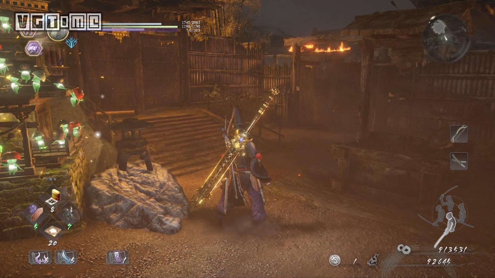 沿著草屋屋頂往下走,右邊可以打開大門,通往第一個神社。左邊可以搭救柴田勝家,如果在支線「半妖包青天」中選擇幫助他的話,他會和玩家同行。