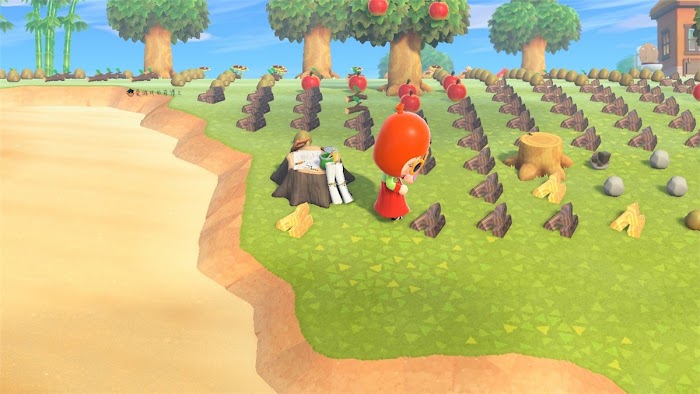 嗯!道理雖然簡單,但是實施起來還蠻複雜和繁瑣的,有興趣的小夥伴可以繼續往下看。我們之前肯定收集了很多素材,比如木材、石頭、水果等等,這些東西全部可以去填滿空位,推薦用自訂圖案在地上塗鴉,回收時會很方便哦!當然,如果不夠的話,還可以去搖樹木,一棵樹最多可以搖落14根樹枝呢,夠大家用了!