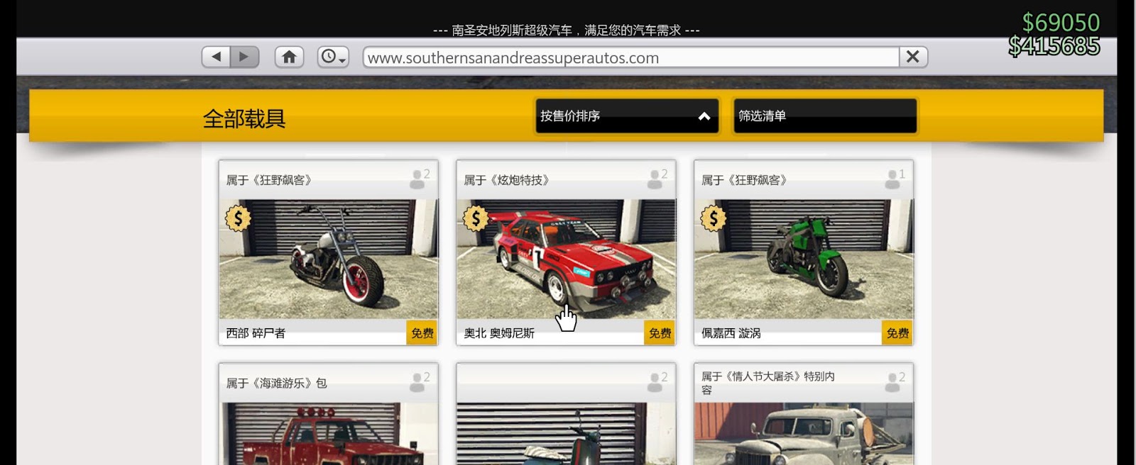 打開“傳奇車業”,點擊“按售價降冪”,這裡有6輛可以白拿的載具。