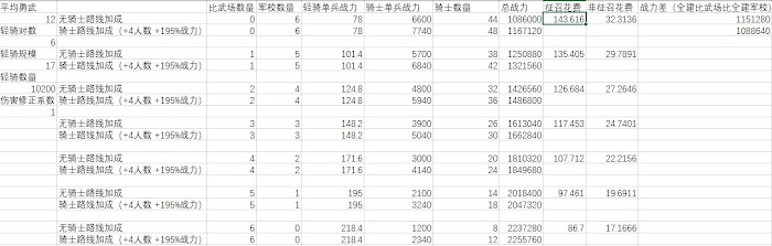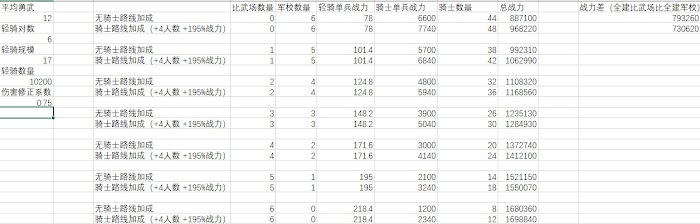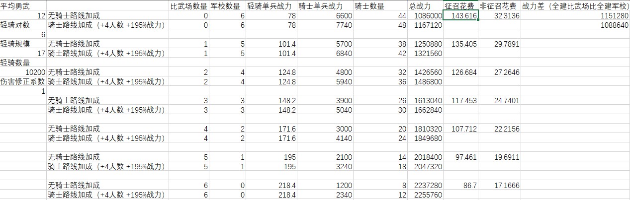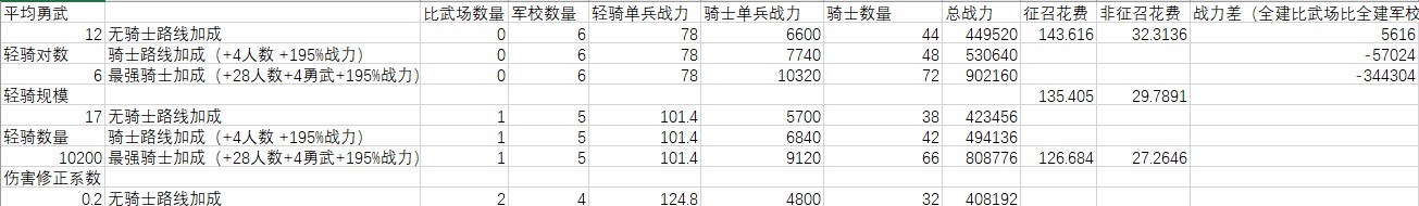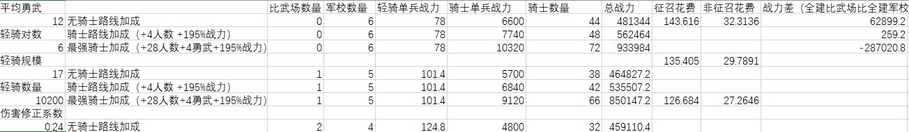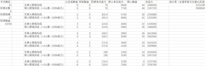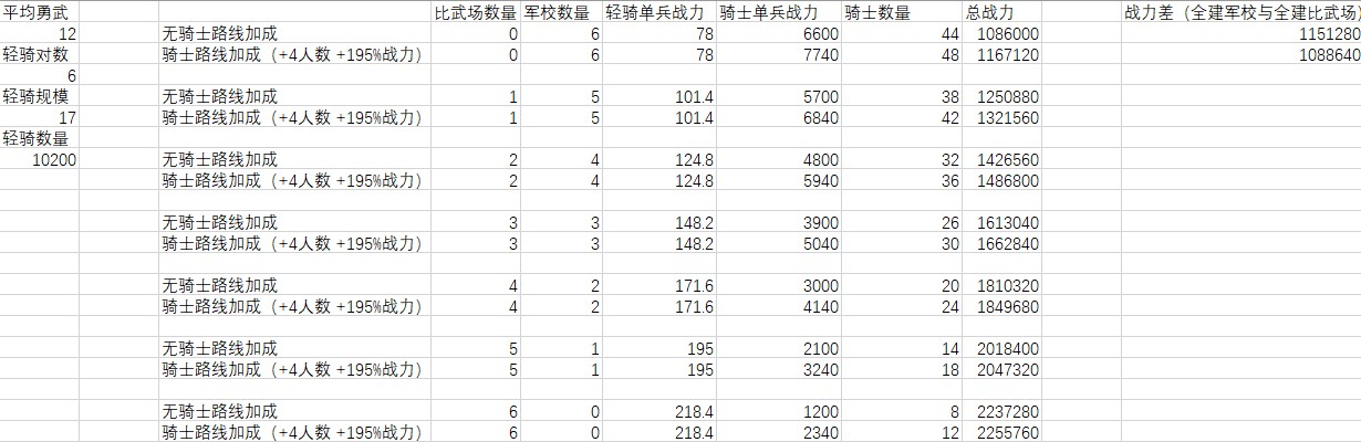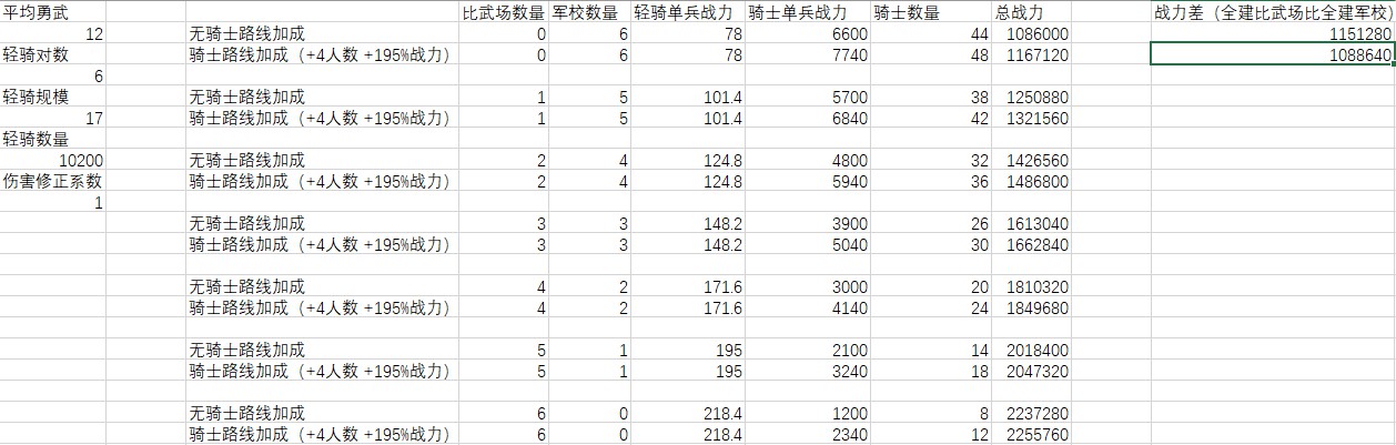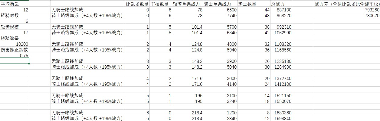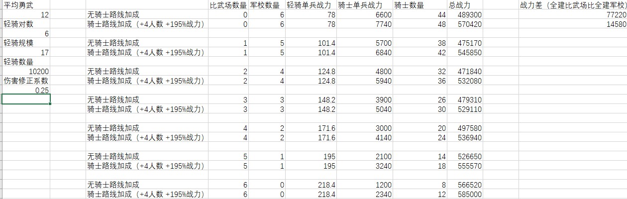 普通軍事路線加成時(+4上限,195%戰力),輕騎被克制到只發揮0.24傷害以下,全建軍校比全建比武場好。