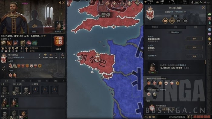 這次創建了不列顛帝國,我擁有的的頭銜只有不列顛帝國以及法理外的全直轄布列塔尼公爵領,可以看到在繼承人會繼承所有的領地,因為搞定了帝國選舉後,全直轄的公爵領投票人只有我一個。
