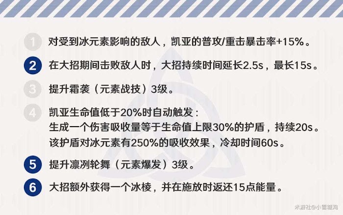 命2可以延長凱亞的大招持續時間,有意思的是:在大招持續時間內,隊友擊殺敵人也可以為延長凱亞的大招時長。這意味著,凱亞不需要站場就可以把大招的持續時間最大化,最長可達15s。因此,凱亞與可以進行持續性風/火/雷/水(即可以與冰元素發生反應的元素)輸出的角色有著良好的抗性,比如:雷澤。