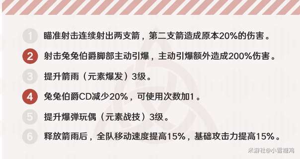 從命座來看,命2和命4可以為安柏帶來玩法上翻天覆地的改變,但對輸出能力的提升卻十分有限,目前來看適合雜技隊。命6可以提升安柏的輔助能力,但就如前文所說,基礎攻擊力後期會成為非常容易被稀釋的加成屬性,因此能夠帶來的提升也十分有限。