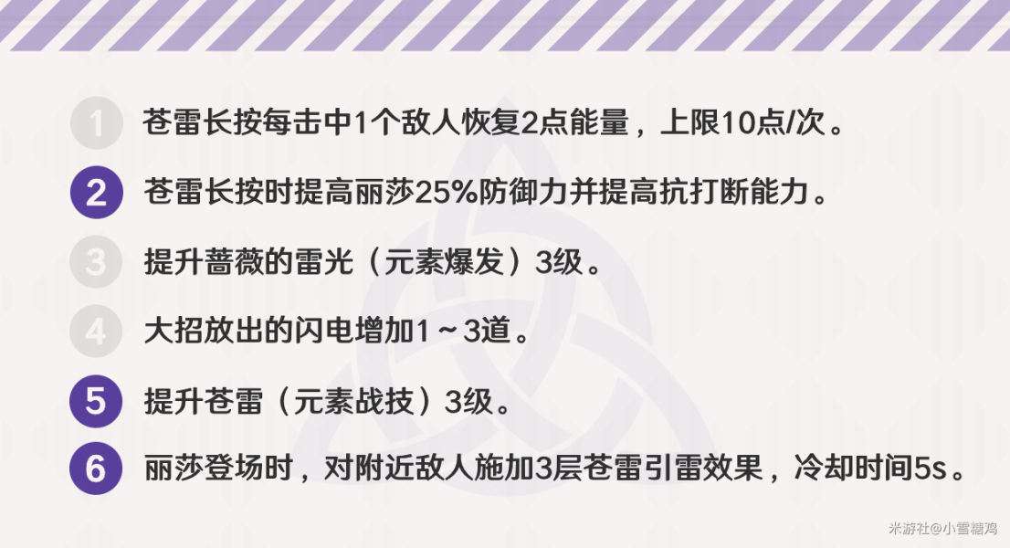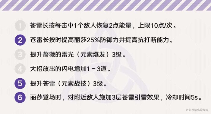 蒼雷(E):主要輸出手段。短按引雷,引雷層數會在敵人身上用數位識別碼;長按降雷,降雷傷害隨引雷層數而提升(至多3層)
