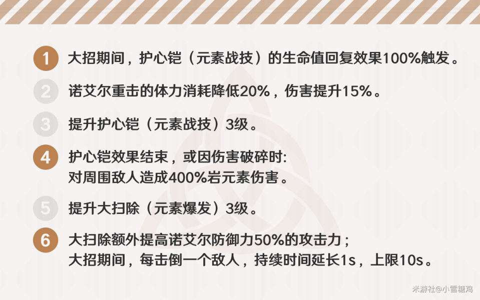 每4次普攻/蓄力可減少1s護心鎧CD。在諾艾爾不當主C的陣容裡,次天賦只能作為錦上添花的存在,減CD的效果在實際應用中會有感知,但並不強烈。