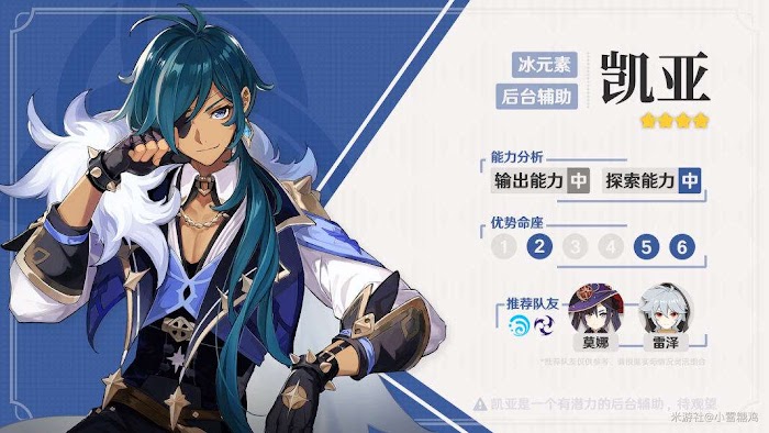 由【水+冰=凍結】這一反應可知,擁有此天賦的凱亞與水元素角色具有良好的相性。與能夠為敵人附著水元素的角色組成一隊時,凱亞的能量回復速度可以得到大幅提升,作為其核心輸出技能的大招,開啟頻率也會提高。