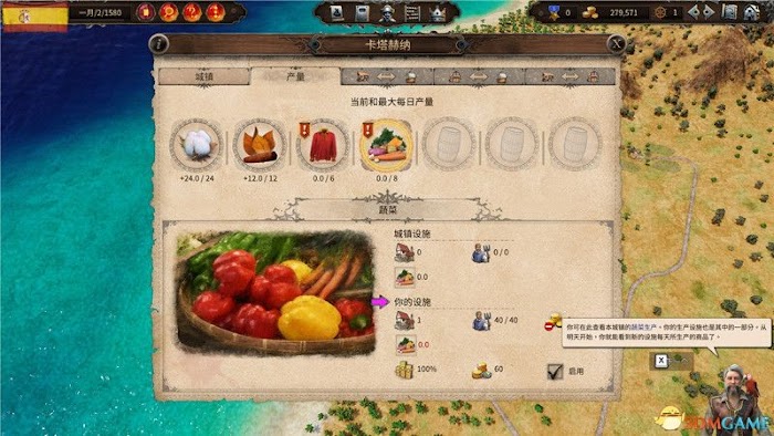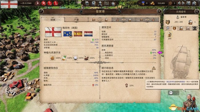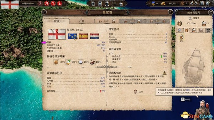 你可以在資訊面板中找到它隸屬的國家,以及當人口,商品產出,資源和社會滿意度情況。