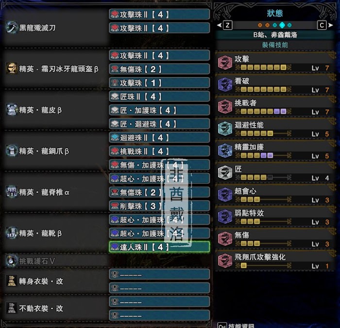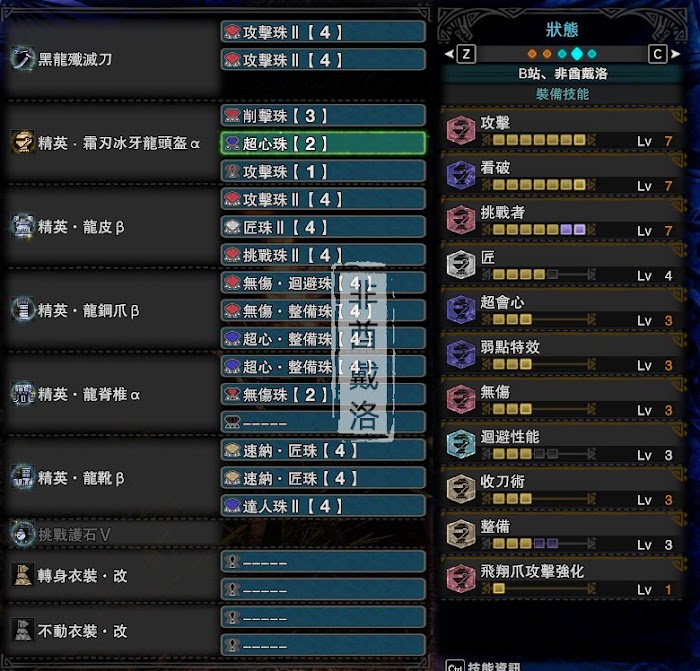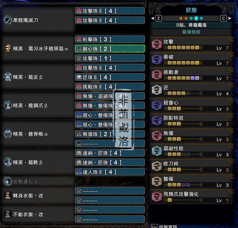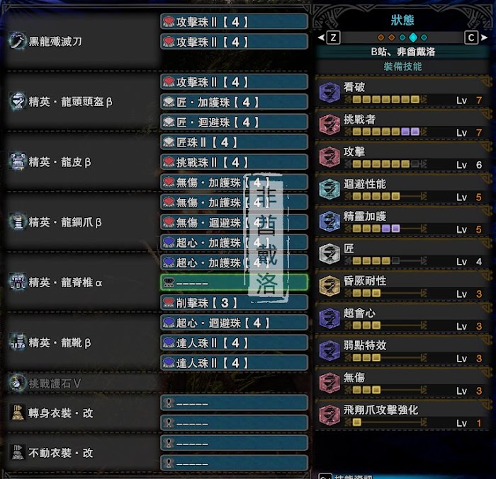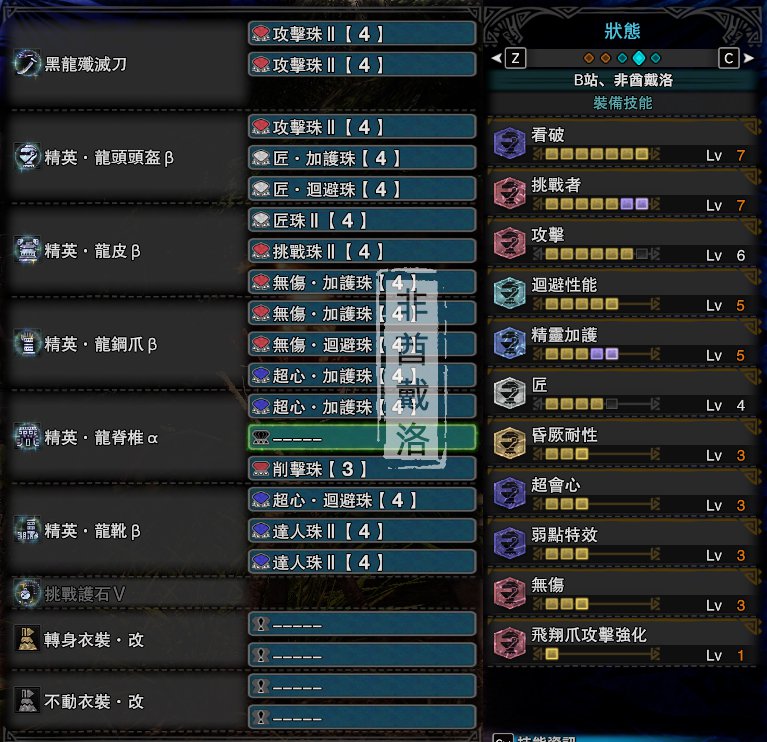 黑龍套的孔位非常優秀,所以能調整的空間非常巨大,配裝只是給一個範本,並不代表著唯一指定配法。大家最好根據自己的需求適當調整。另外這次的全武器配裝也不涉及曆戰王冰咒龍的裝備。