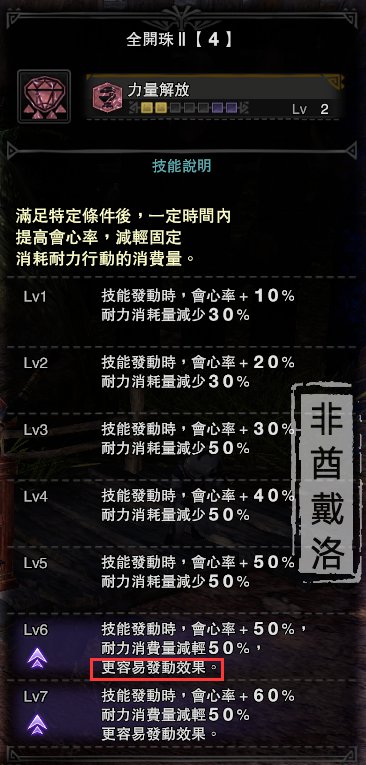 不過力量解放一般出到6級就夠,因為6級就有這個特效,而7級其實沒啥必要,首先出力量解放7級只是觸發後多加了10%會心,但是實際上50%會心在現在這個版本,即便是黑龍的高負會心武器也足以溢出會心,所以一般都不會出滿7級。這個在以後的配裝會稍微提及,這裡就提前跟大家說下。