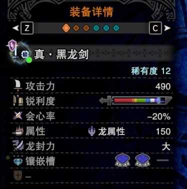 武器:真·黑龍劍。350面板,自帶紫斬,-30%會心,客制一吸一會一屬或者一攻一吸。可以不客制會心的原因是如果同時出精神抖擻和看破7,會心率其實是大大溢出的。