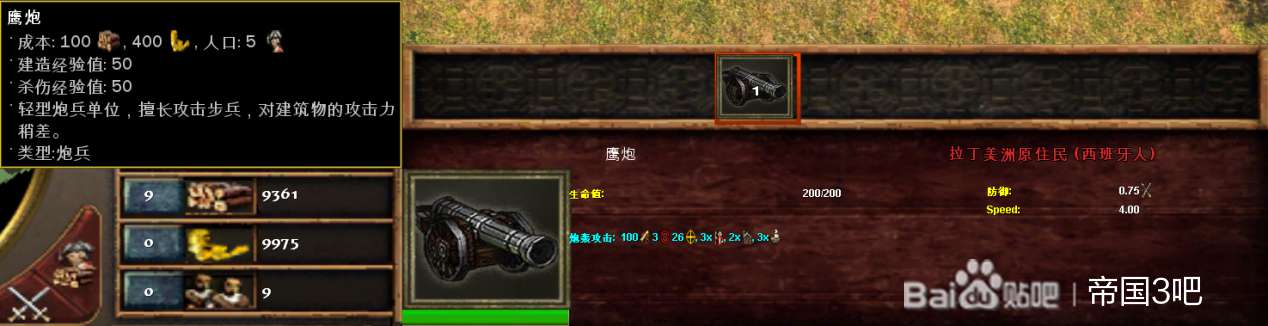 點下升級按鈕後,儘快收集150肉金。發的700木用於造1兵營+5房子,兵營不間斷的造火槍手。堡壘時代首先髮卡2鷹炮,隨後視情況發12XX與5X騎。之後兵卡連發以求一波帶走對手。注意步兵不要距離2鷹炮太遠,否則二炮容易被對手騎兵偷掉;還要注意對手是否發了cm卡,以免被大民兵和藏起來的主力包餃子。