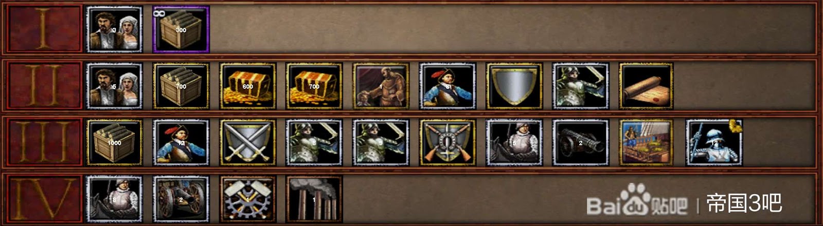 發現時代如前文所述,800肉收集齊全後,選擇1塔+200金選項升級。升級期間派幾個農民湊齊100金。探險家和狗繼續在外面打寶藏——畢竟打寶西班牙的最強項。到達殖民時代後立刻發700金;派一個農民收集升級送的200金,後面700金到的時候,你的食物也早就溢出很多了,你就可以派六七個農民去收集金箱,然後選擇8XX(配合散兵直接打一波)或4輕騎(騷擾對手農民)或10弩手(防rush,但不推薦)升級。