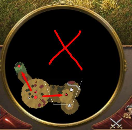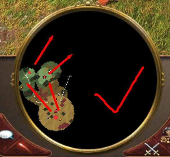 下圖是一個正確的探路方式,探險家與狗並排走,視野儘量不重疊。這樣就能在短時間內盡可能探索更多地圖,發現寶藏後也可以立刻集中火力打下來。如果探索途中有貿易站或不需要的寶藏,我們就可以繞開它,以免浪費探險家寶貴的時間。