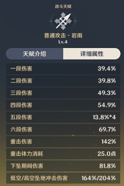 由於e、q冷卻時間的存在,縱觀目前所有角色中,能站場輸出的不外乎是依靠普攻/重擊進行輸出的角色。而鐘離的普攻倍率可以說是全遊最低(圖中以同為長槍角色的香菱為例,香菱為1級天賦,鐘離為4級天賦),而無法附魔成岩屬性也導致普通攻擊無法享受自身突破和聖遺物帶來的[岩元素傷害加成]效果,同時鐘離自身也沒有任何對普攻的加成。所以說在這個流派下,鐘離幾乎是不能用的,很弱。