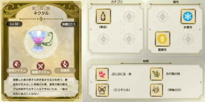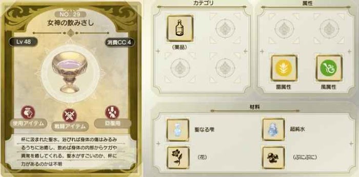 只要喝一次女神的飲料就可以為全體參戰隊員附加效果。比禁忌萬靈藥劑的等級要低,製造也更方便,可以先做這個。