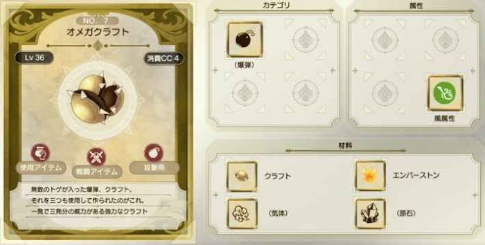 從雜兵戰到BOSS戰均有效的物理傷害炸彈。按照爆裂海膽→詭雷→終極詭雷的順序變化配方,Lv4時即可進行調合,無論是誰都可以裝備的優秀道具。