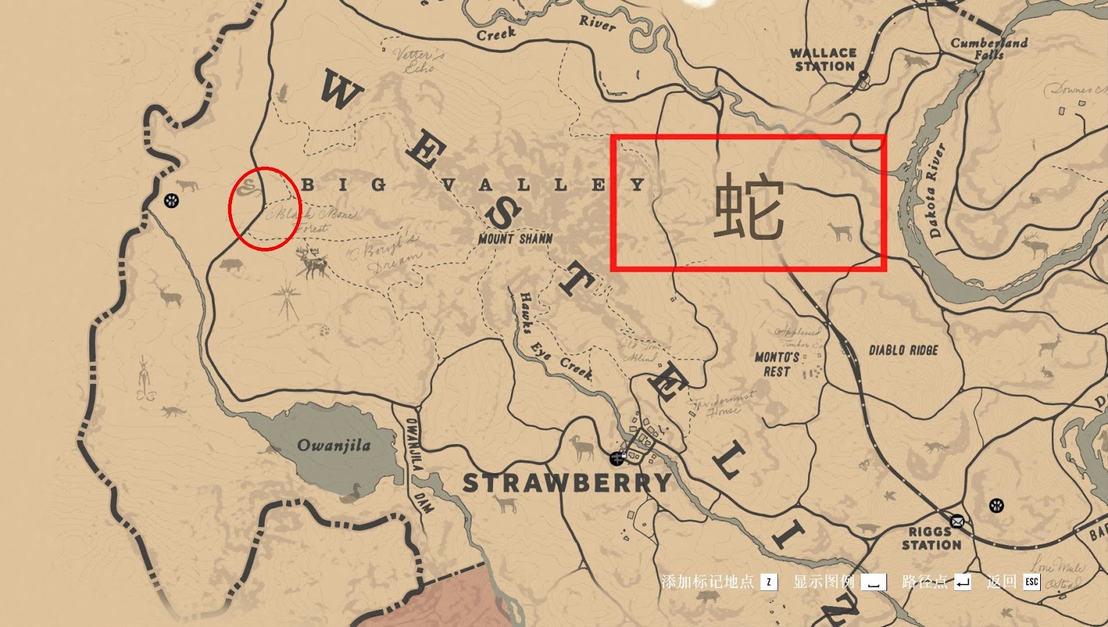 完美的蛇皮:分佈廣,草莓鎮左上,附近有美洲獅,這個點比較集中,至少有2只。捕獵步槍或弓箭小型箭。