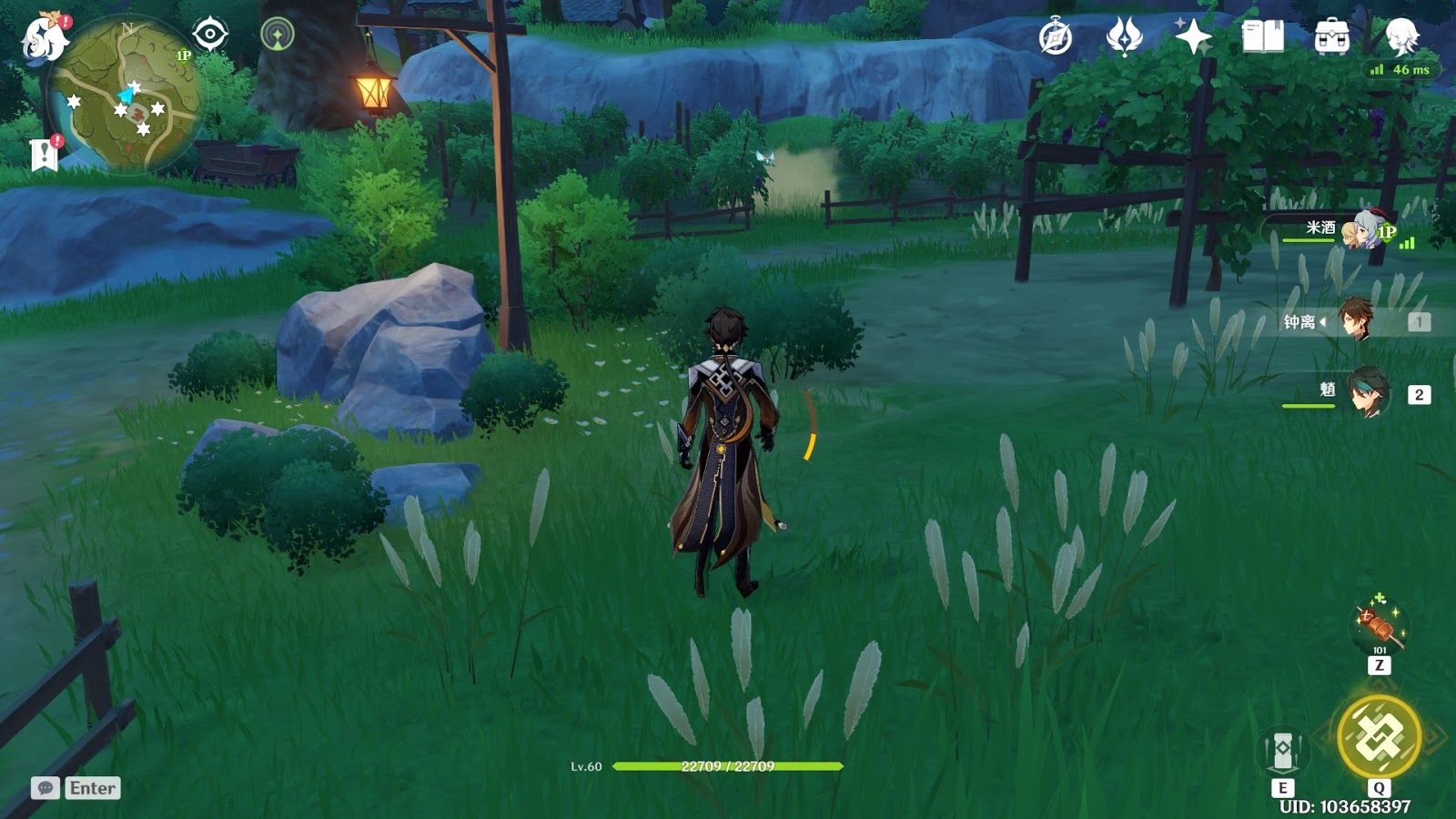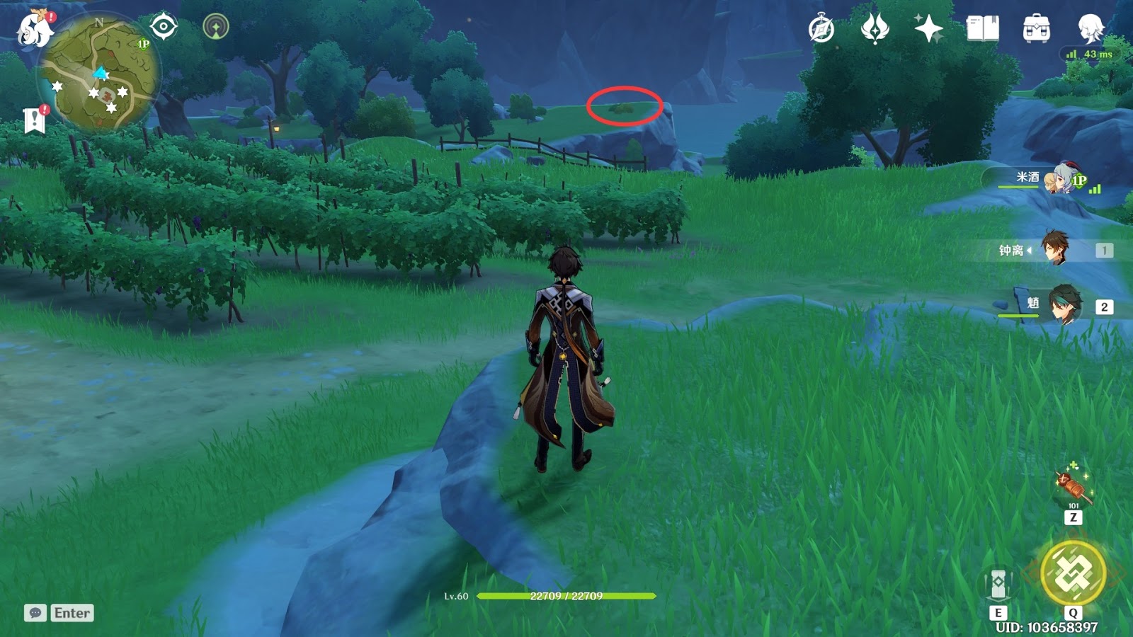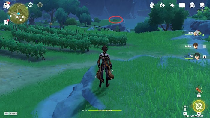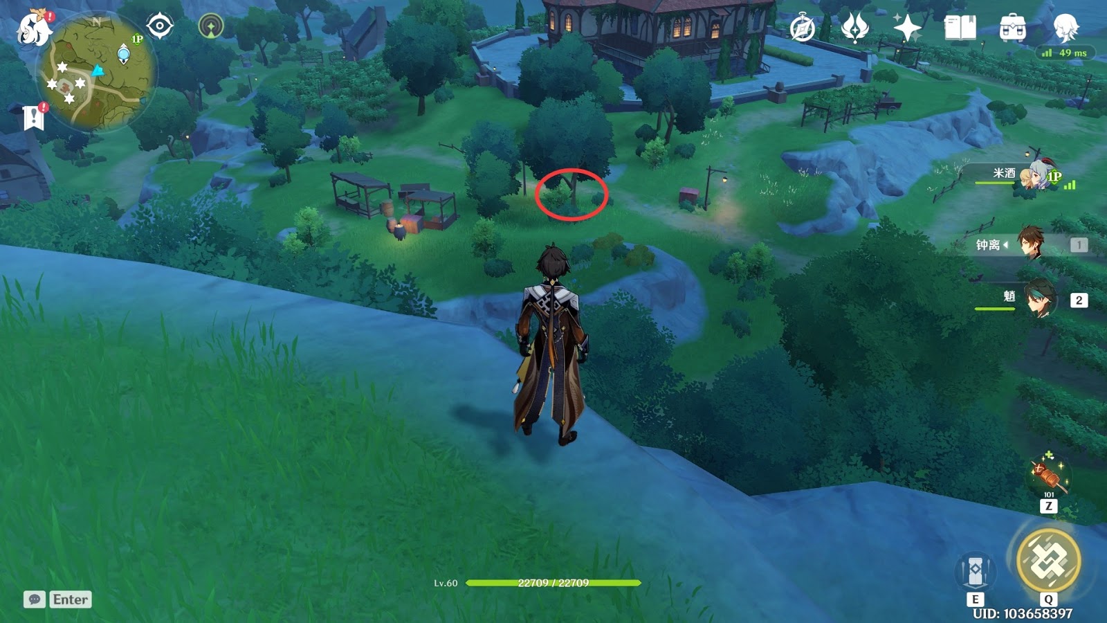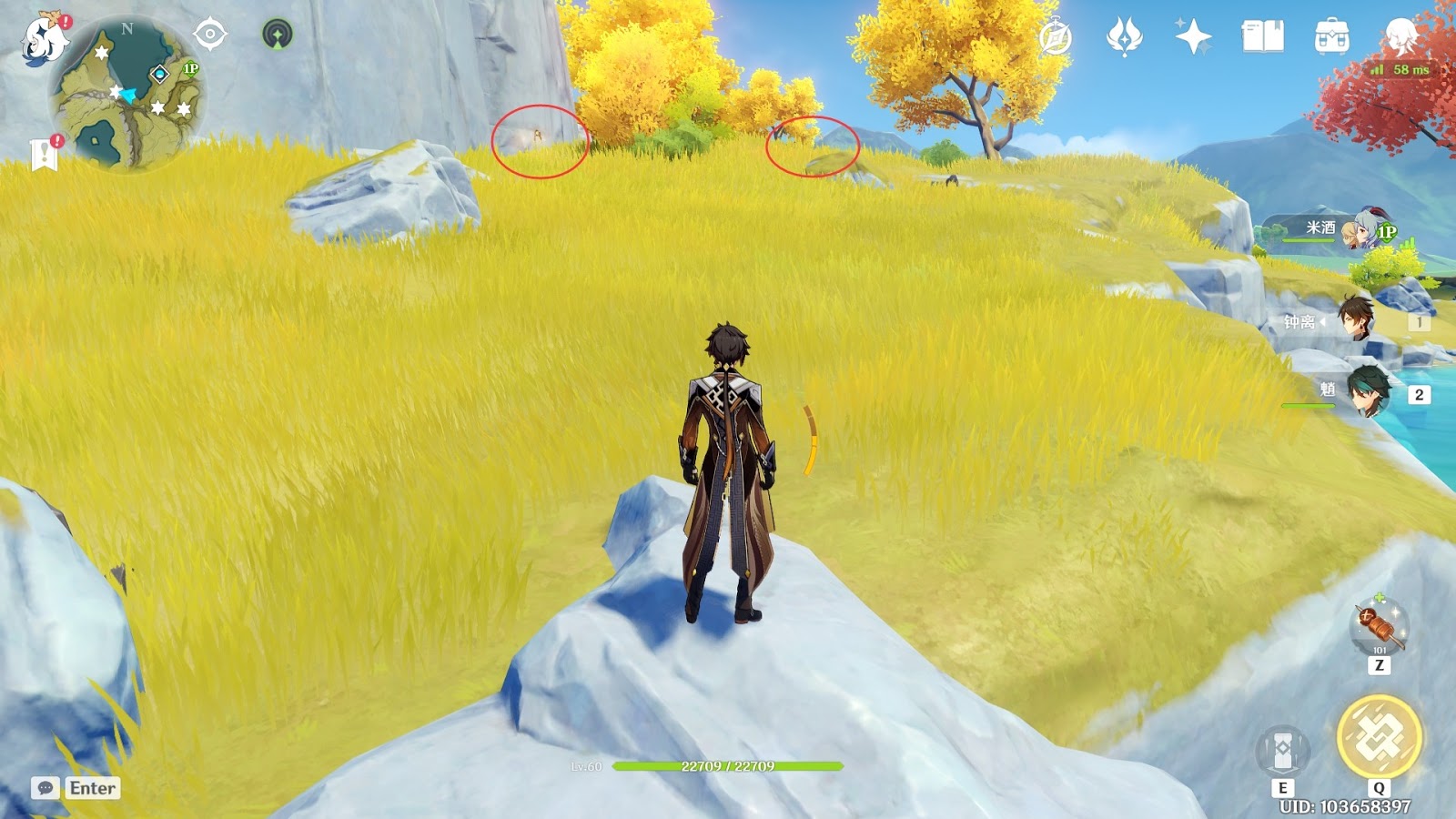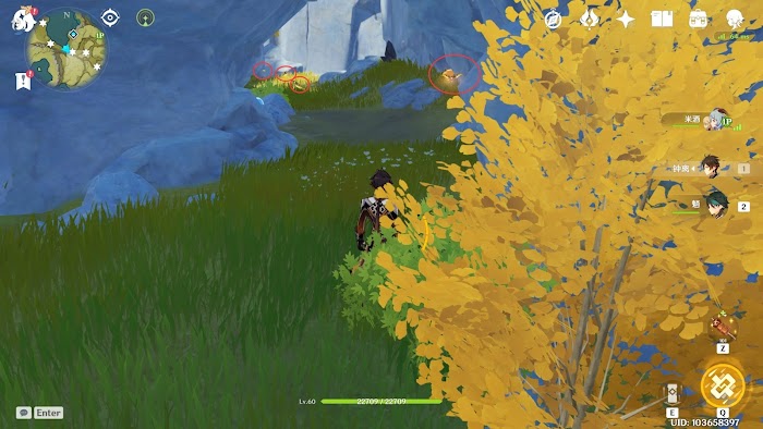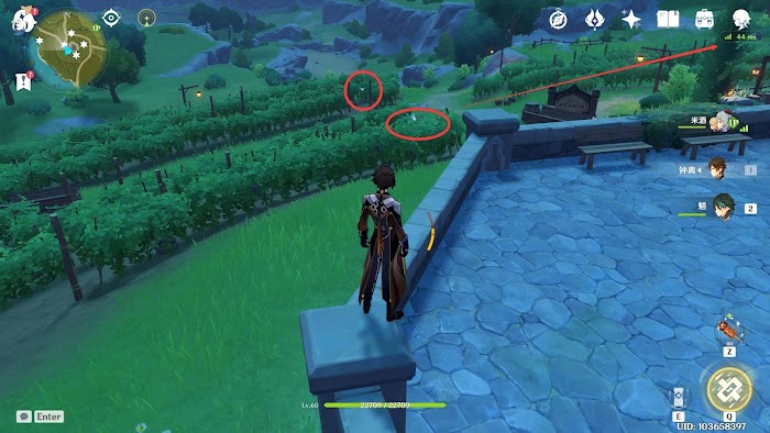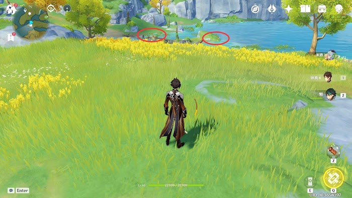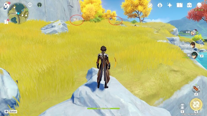 先去宗室本右上那個傳送點,到了後往右邊看,會有一個岩史萊姆,然後有2只晶蝶,之後過橋在兩個丘丘人躺著的花圃內有兩隻晶蝶。