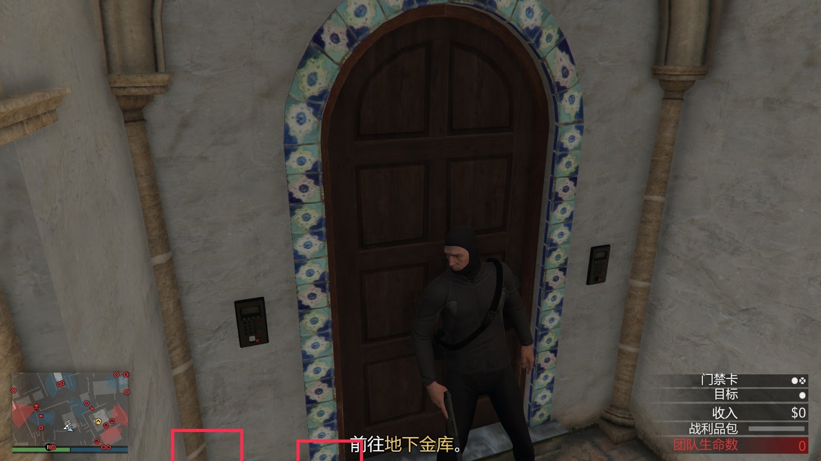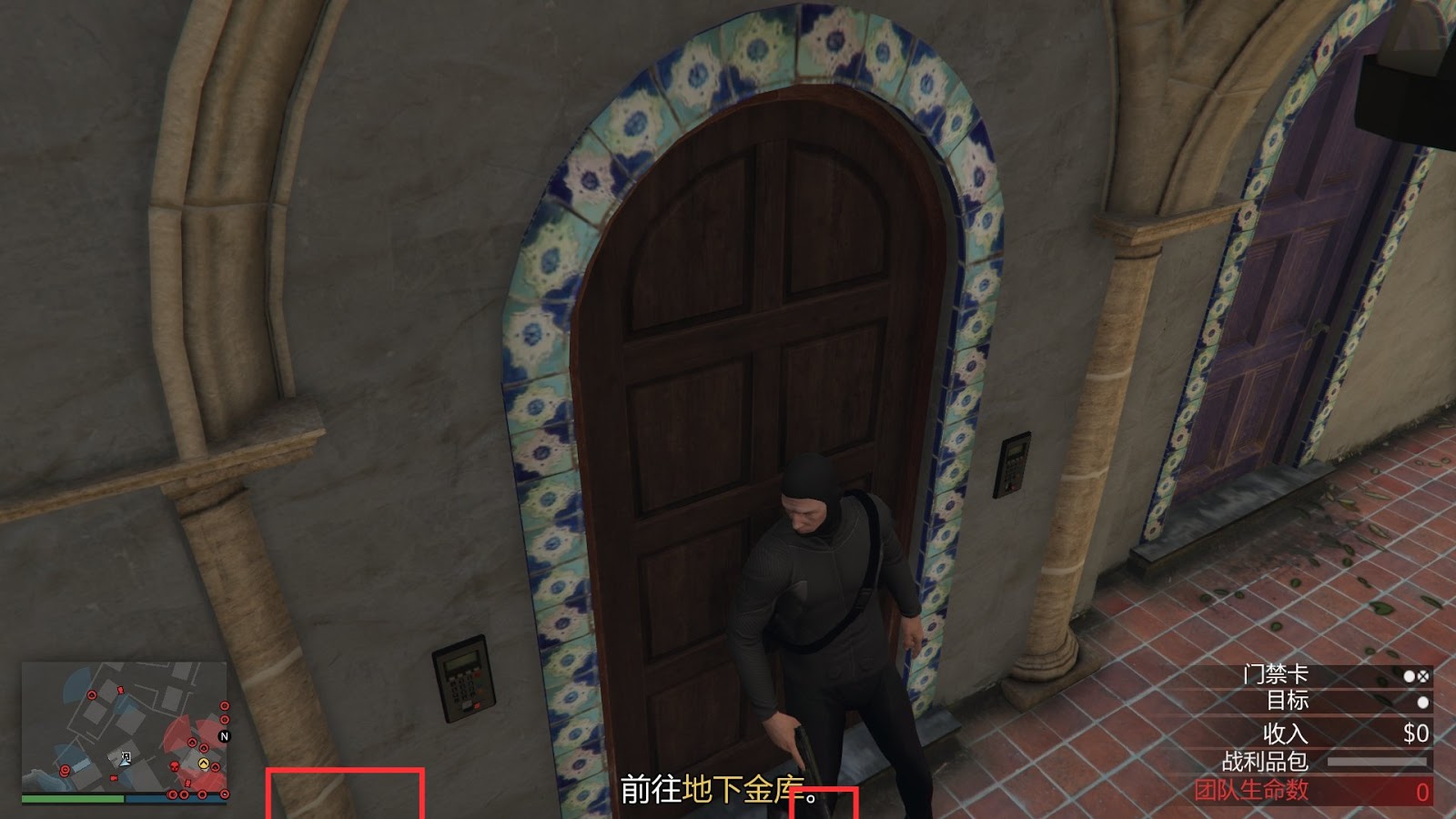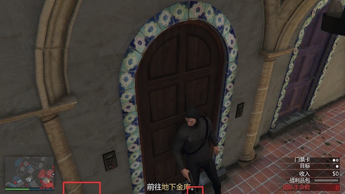 如圖所示,人物靠在門的右側,保持臉部輪廓線在門的中間,左側柱子的第三根線與螢幕底部邊緣相交,門左側的紅框內的瓷磚中心圓形圖案與螢幕底部邊緣相切,按下D+滑鼠右鍵(D稍提前)即可開啟。
