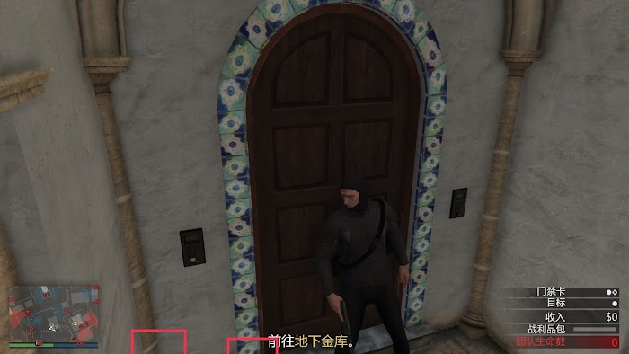如圖所示,人物靠在門的右側,保持臉部輪廓線在門的中間,左側柱子的第二條線與螢幕底部相交,字幕句號在槍管偏左的位置,按下D+滑鼠右鍵(D稍提前)即可開啟。