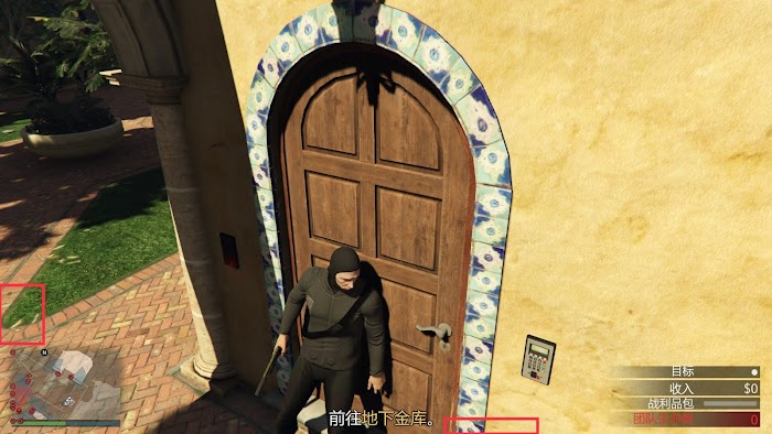 如圖所示,人物靠在門的左側,保持臉部輪廓線在門的中間,畫面左側的草坪圓弧與螢幕左側邊緣相切,右側紅框內瓷磚中央的圓形圖案與螢幕底部邊緣相切,按下A+滑鼠右鍵(A稍提前)即可開啟。