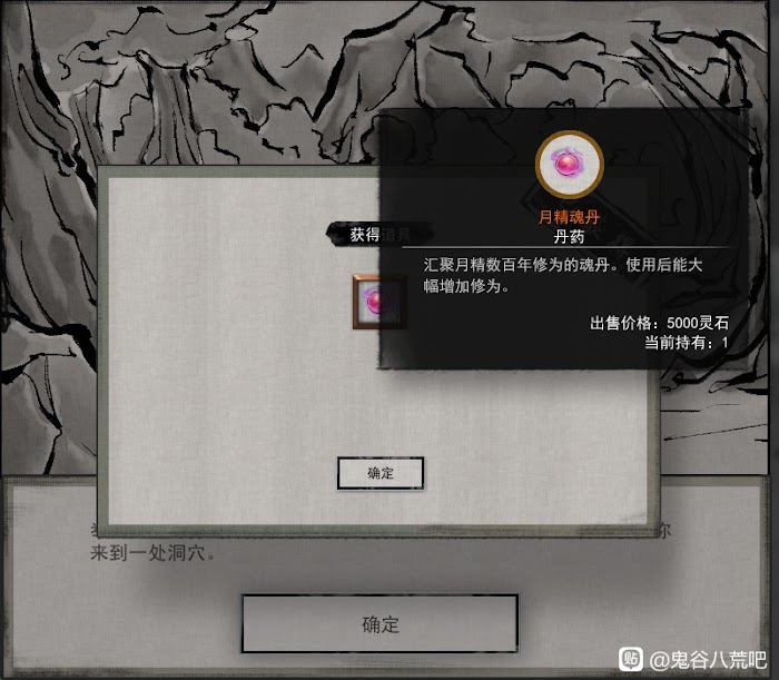 接下來就是劇情,然後選【豈能空手而歸】,打一隻蛤蟆獲得一枚【月精魂丹】和一個十年期限的後天氣運【月枝】,效果如樓下。