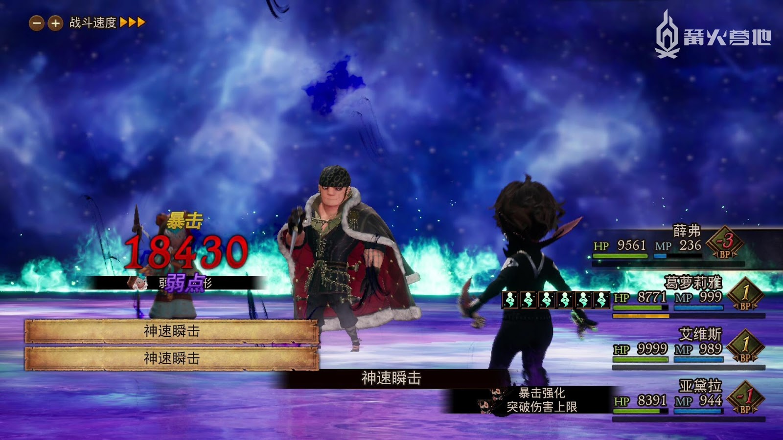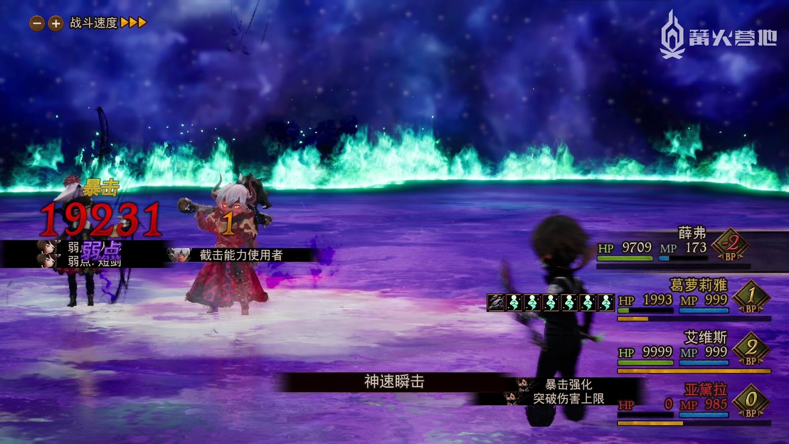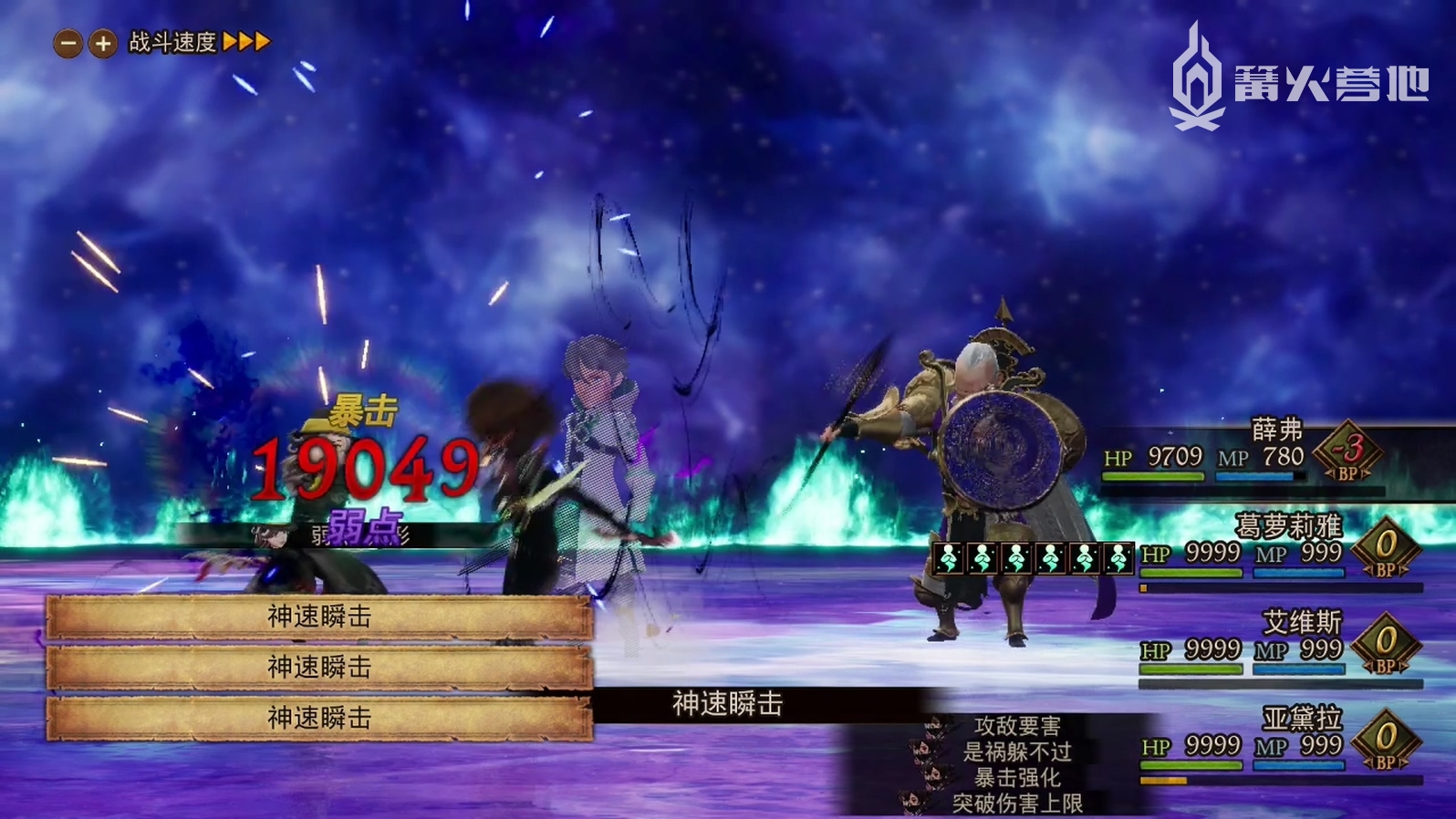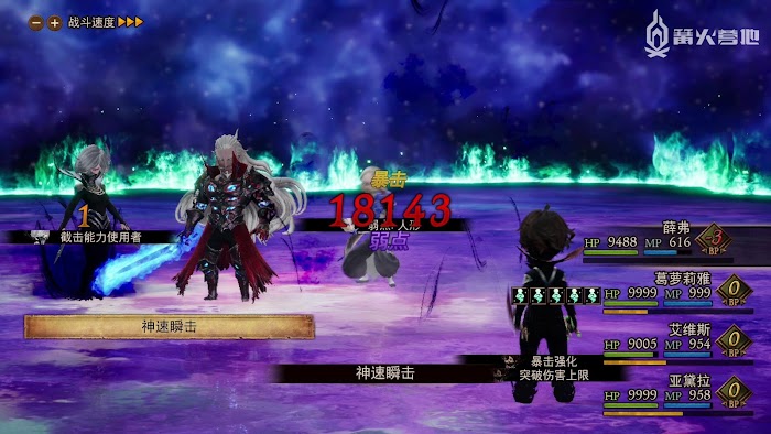 黑魔道士的 HP 較低,開場可以直接用盜賊的神速瞬擊帶異常在處刑者的保護之前秒掉,注意在處理處刑者之後,勇者會不停使用高威力技能以及全屏技能,場上一定要有留存捨己為人技能的輔助,此外必須要有雙白魔在場保證復活。這裡的勇者會解鎖每回合降低全員 1BP 的技能,如果我方沒有會自動釋放精靈法術的 15 級導師自動增加 BP,會對行動非常不利。