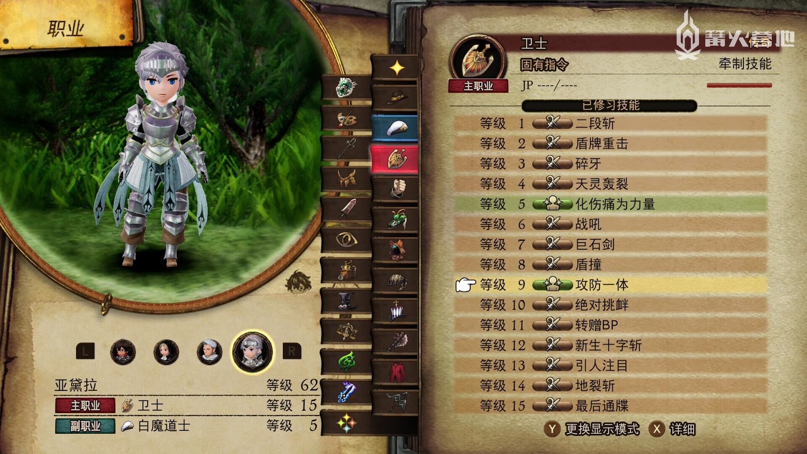 可以持盾的典型戰士型角色,在中早期是是非常好用的能力平均的輸出型職業,最主要利用到的是二連斬系列攻擊「二段斬」和「新生十字斬」等不受屬性影響(受武器影響)的輸出技能,這兩個技能還可以利用武僧的赤手空拳支援能力實現完全無屬性的攻擊手段,避免出現敵方屬性太多,導致半減的尷尬局面。除了基本的輸出技能外,還有降低對方物攻、魔攻的輔助攻擊,以及多個土屬性攻擊方式,並且還能夠進行嘲諷吸引敵人火力。