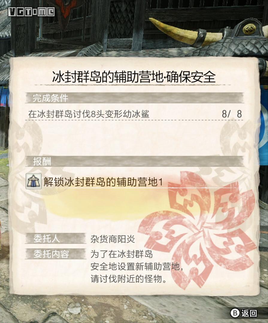 輔助營地 1 位於 6 區和 7 區中間的穀底,可以用翔蟲技攀到高處後落下找到,也可以沿著北部的水域直接往南走找到,解鎖條件是在冰封群島討伐 8 頭變形幼冰鯊。