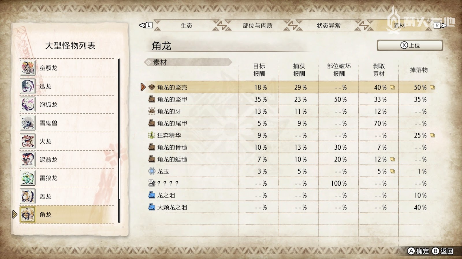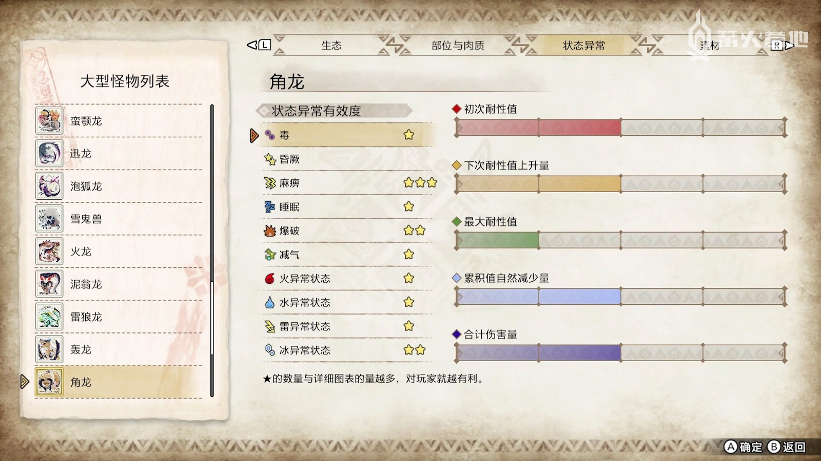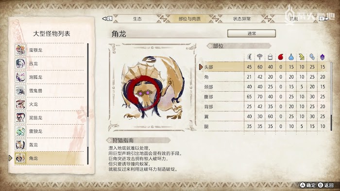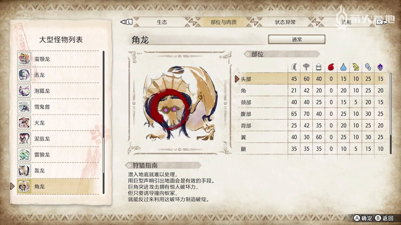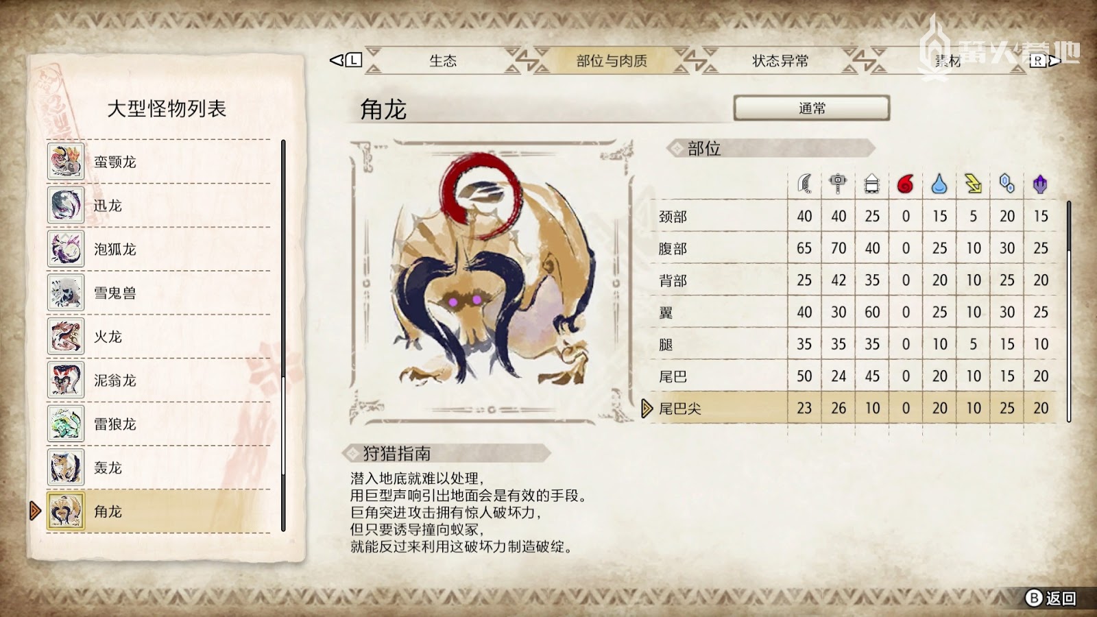 當角龍潛入地底時,玩家會很難處理,此時用巨型聲響將其引出地面會是有效的手段。角龍在用巨角突進攻擊時,傷害非常高。但只要誘導它撞向蟻塚,就能反過來利用這破壞力製造破綻。下面就為大家介紹《怪物獵人崛起》角龍屬性弱點攻略。