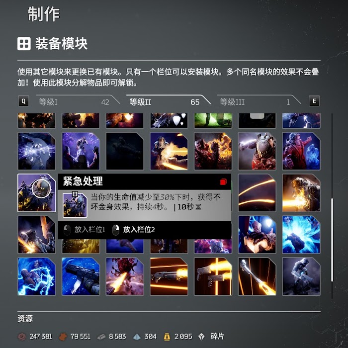 速刷世界15紫裝(42級):可以用於配裝、拆解出未解鎖的Ⅱ級模組、或者拆解成各種製作材料和金屬鈦、還能賣錢大概一件5000(43-50級裝備需要刷遠征副本)