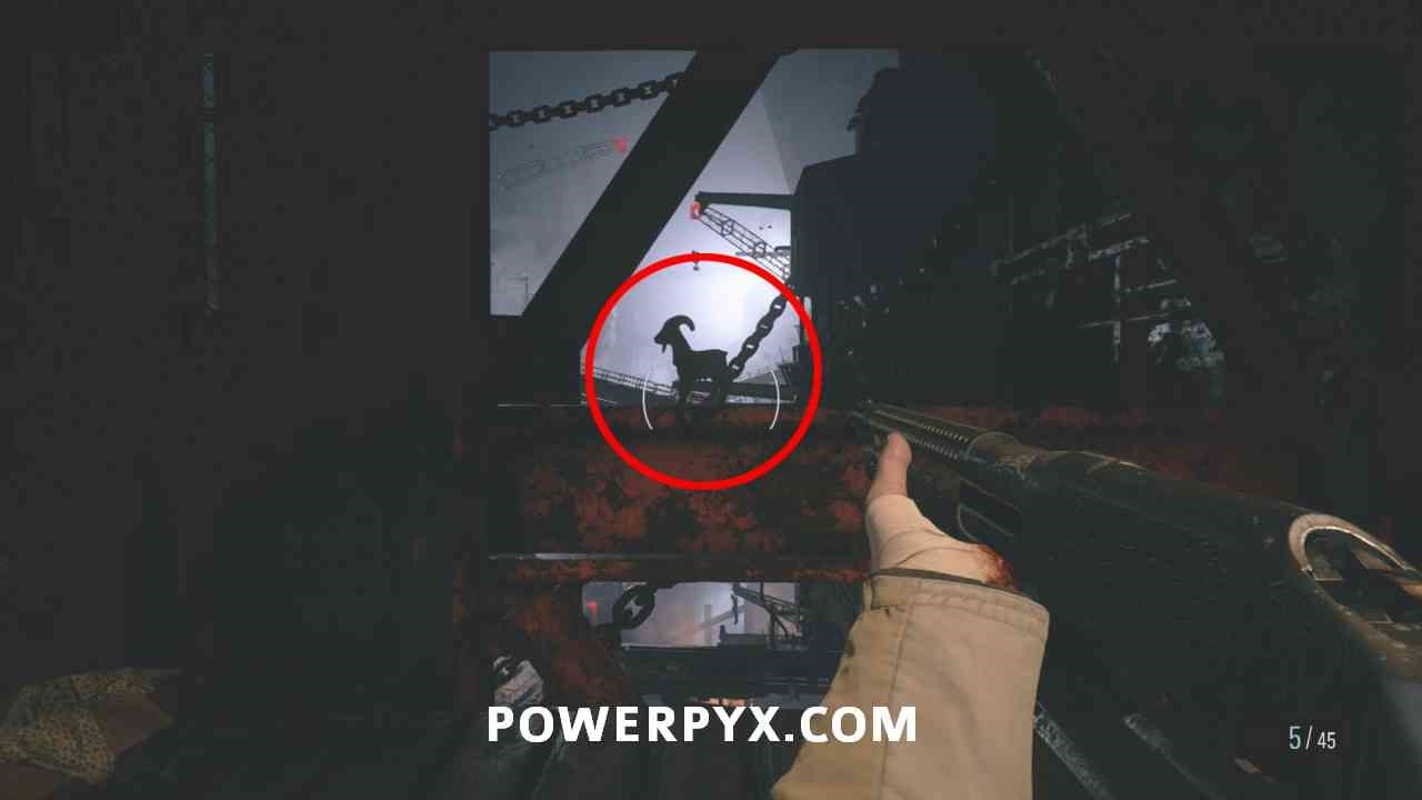 海森伯格工廠地下2層-通風管道:跟隨劇情來到換氣扇扇葉要把主角吸進去的地方,射擊風扇避免被絞碎。在同一區域落地後轉身走到一處平臺(大概是黃色挖掘機鏟的斜破)。山羊就在平臺的其中一個挖掘機鏟子上,比較隱蔽,循聲辯位。