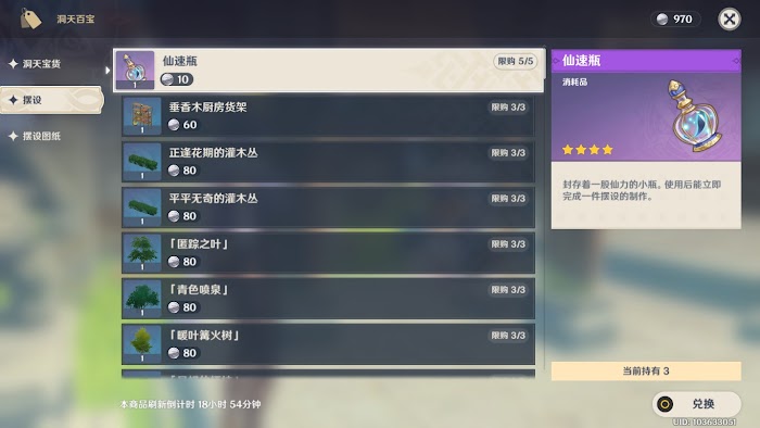 寶幣的花費場地,第一欄洞天寶貨是洞天獎勵的主要產出地,有樹脂經驗書摩拉等獎勵;第二欄有前期每日必換的仙速瓶和一些花花草草;第三欄則是前期應該主要購買的擺設圖紙。