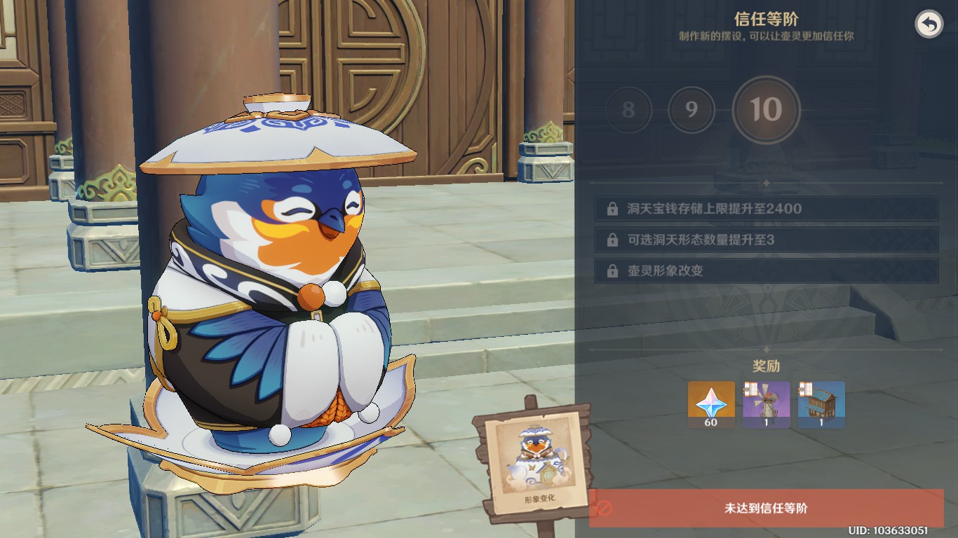 信任等階只能通過製作新擺設來提升經驗,提升後有很多獎勵,主要為原石,以及5,7,9階開新的地圖,8,10階開新形態的更換,6階開須臾樹脂的兌換。