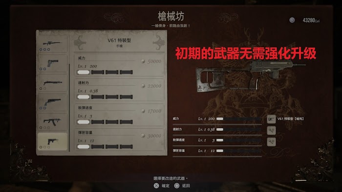 《生化危機8》提供了多樣化的武器給玩家們選擇和體驗,這裡值得注意的是:我們在遊戲初期獲得的武器大可不用強化升級,因為遊戲越到後面,武器越強力!取得新武器就可以把舊武器淘汰掉!