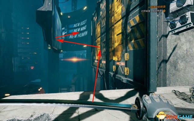 ②.回頭,如下圖箭頭所指,跳上去,殺上面的手槍兵。
