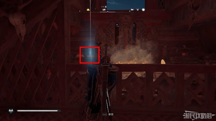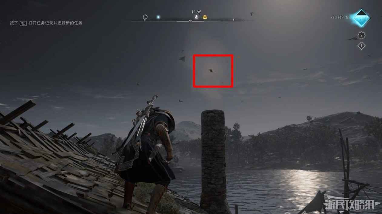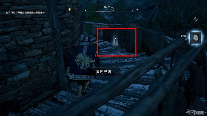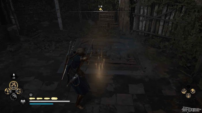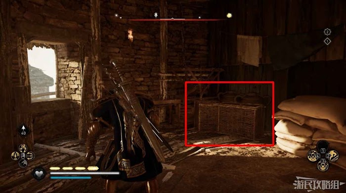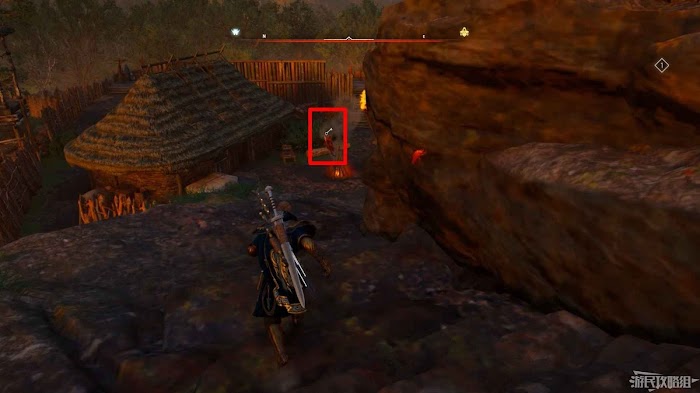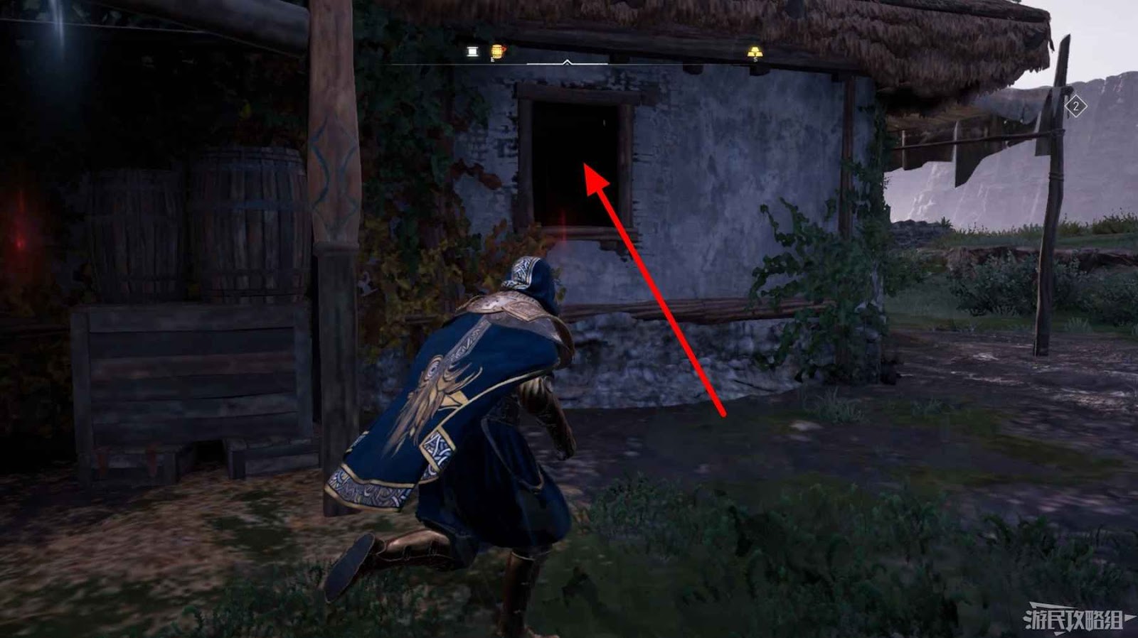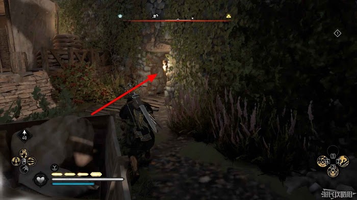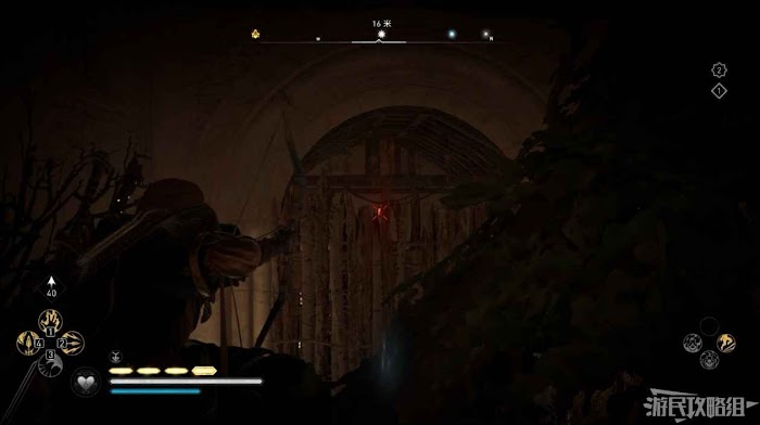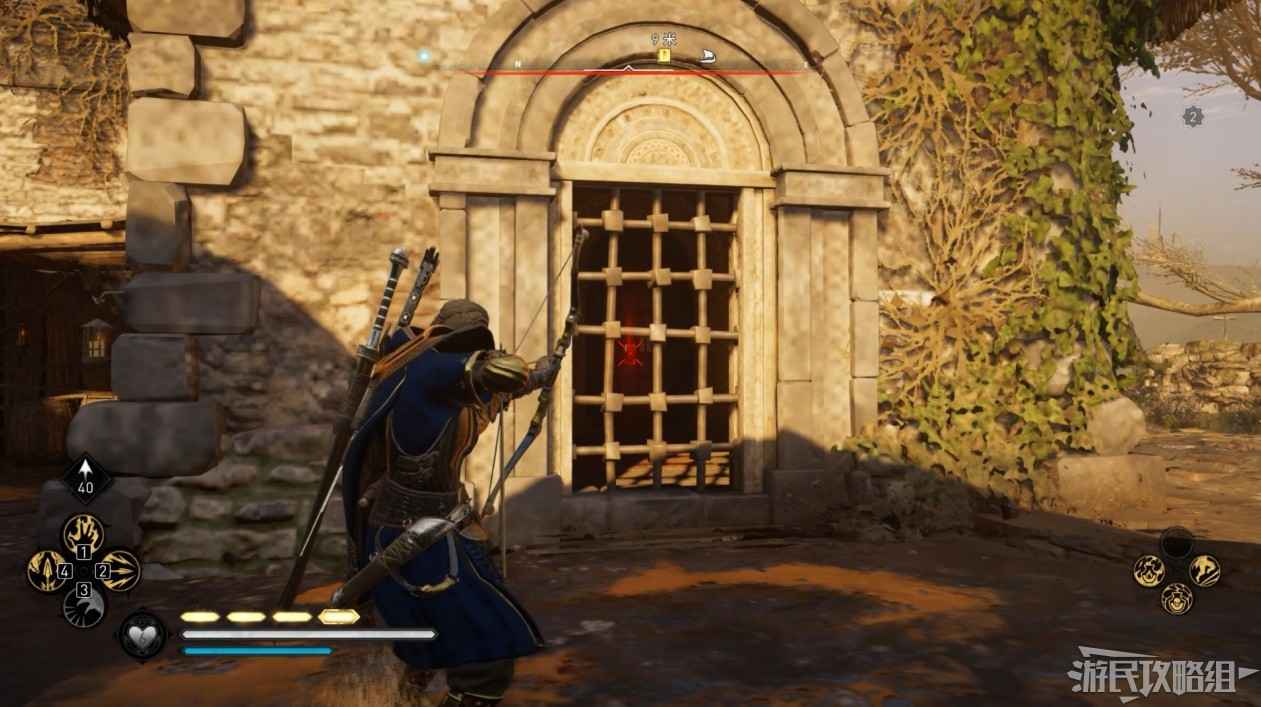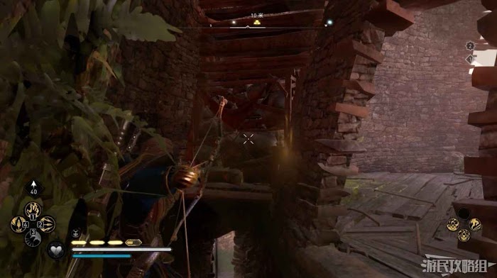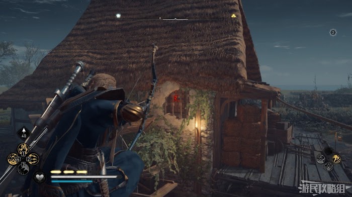 首先來到湖東側的小屋處,在小屋北面的牆上有一個缺口,通過缺口射擊箭矢可以破壞門閂。