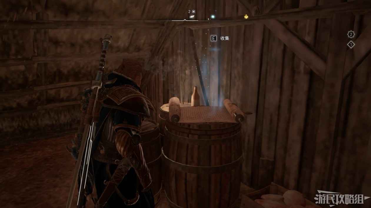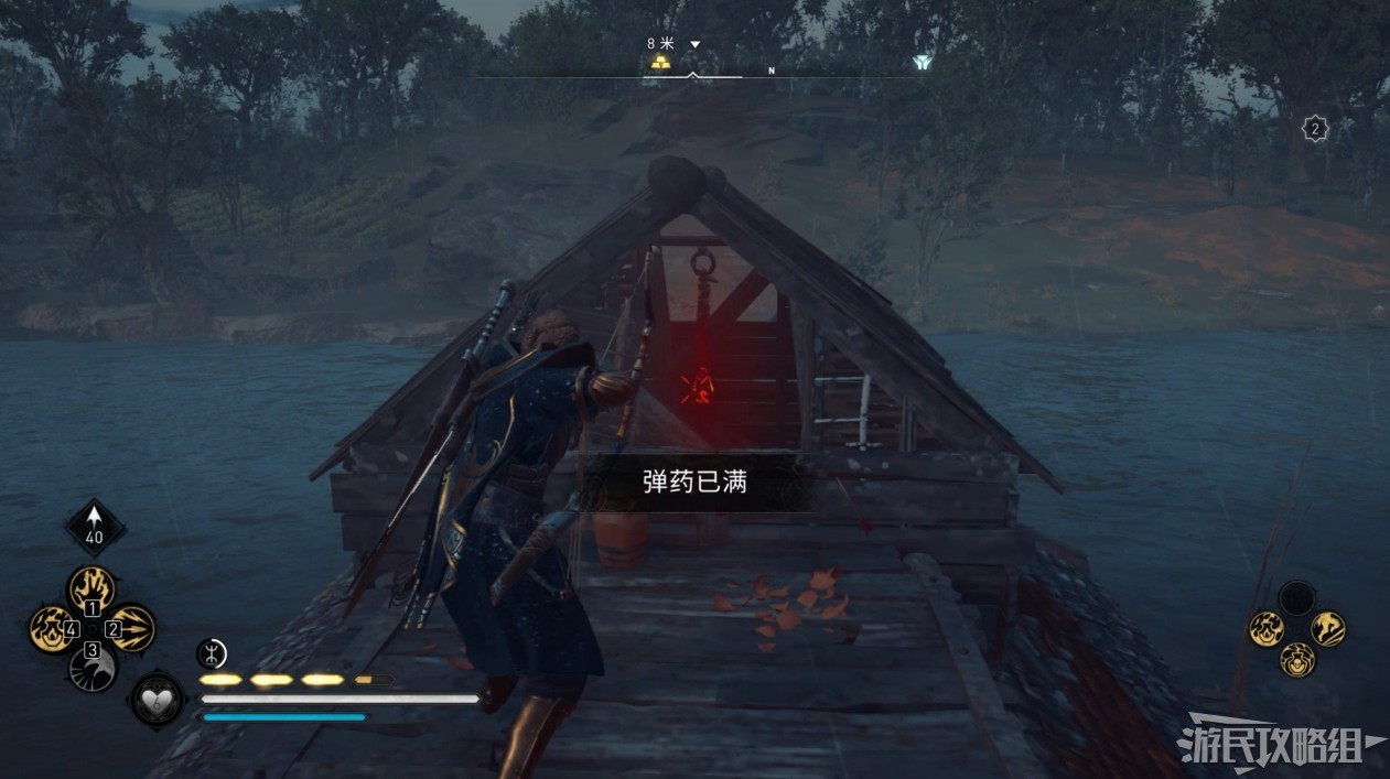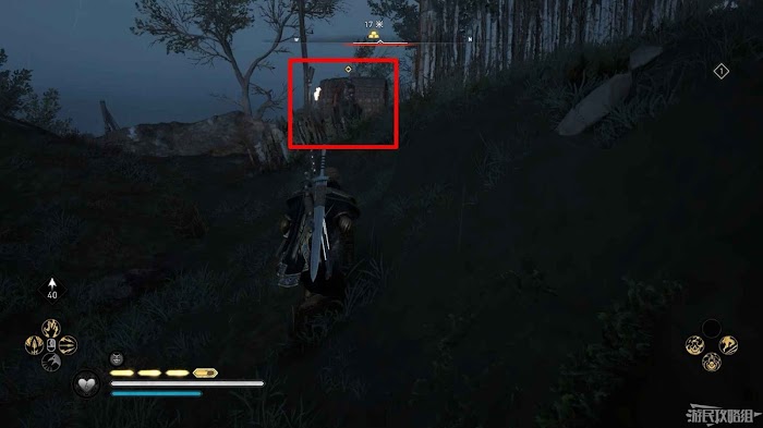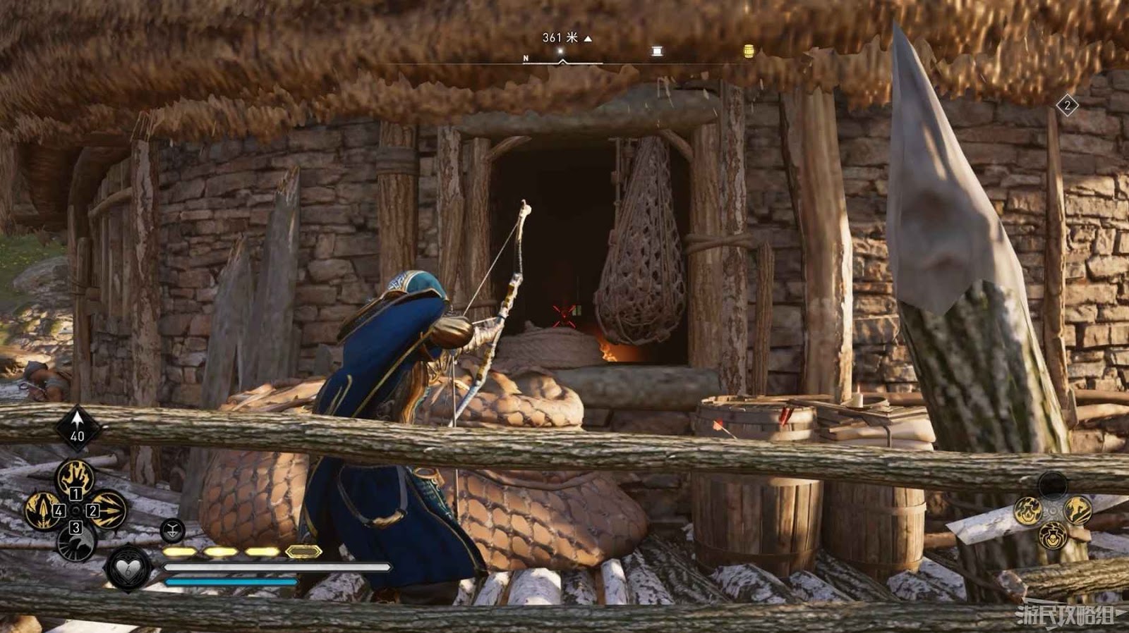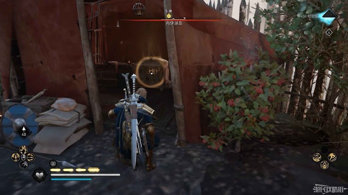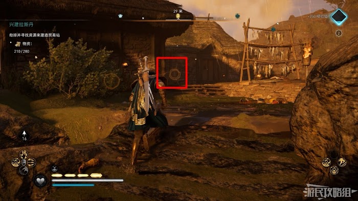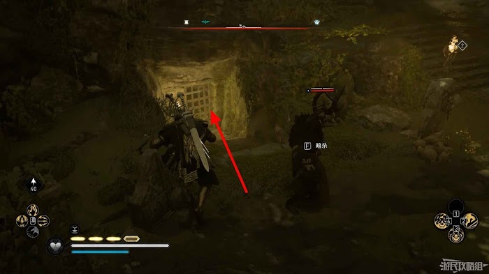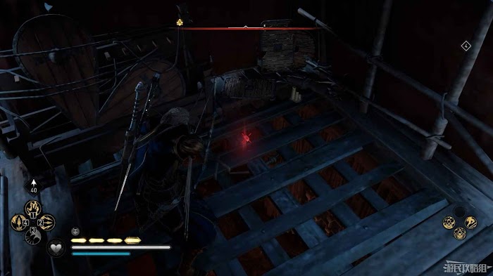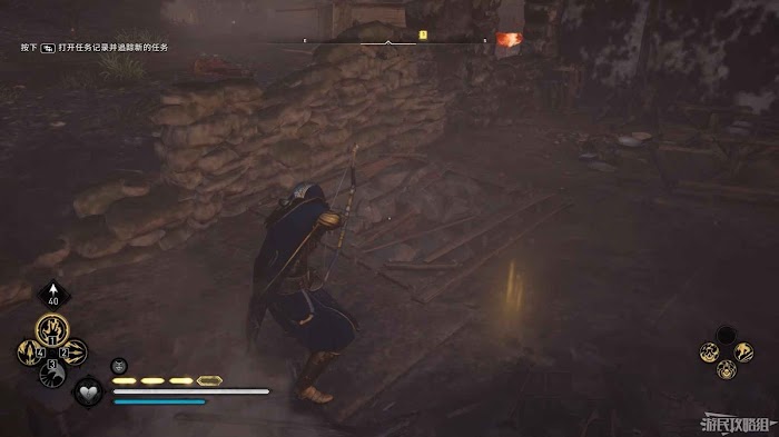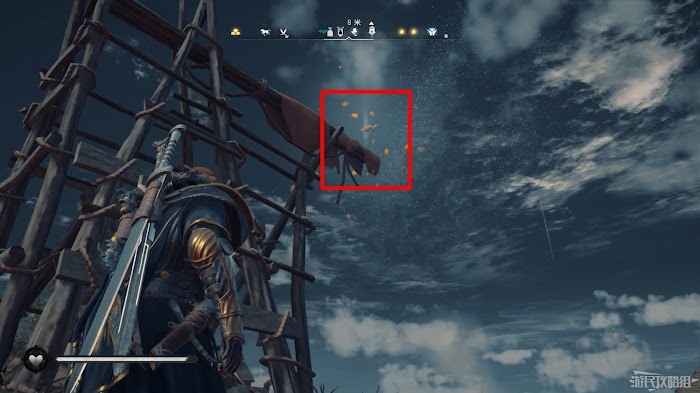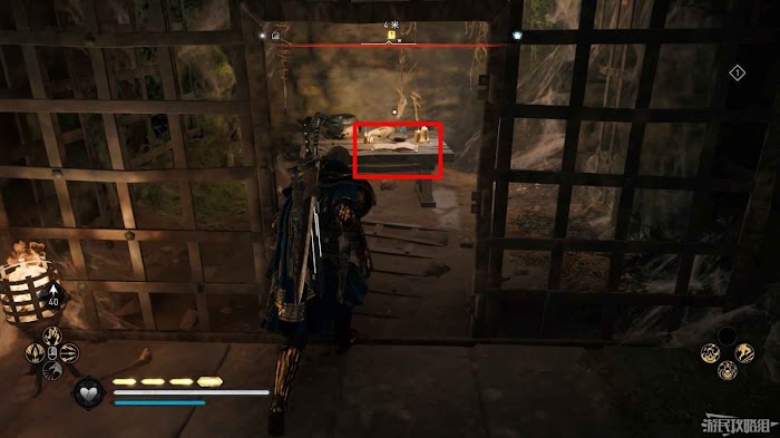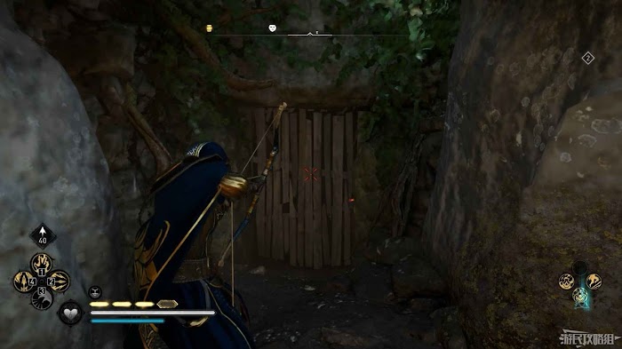 首先來到湖東側的小屋處,在小屋北面的牆上有一個缺口,通過缺口射擊箭矢可以破壞門閂。