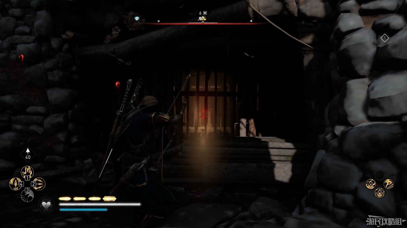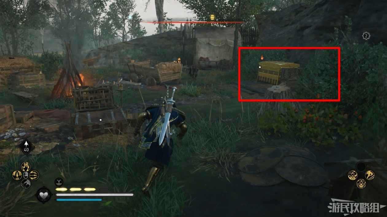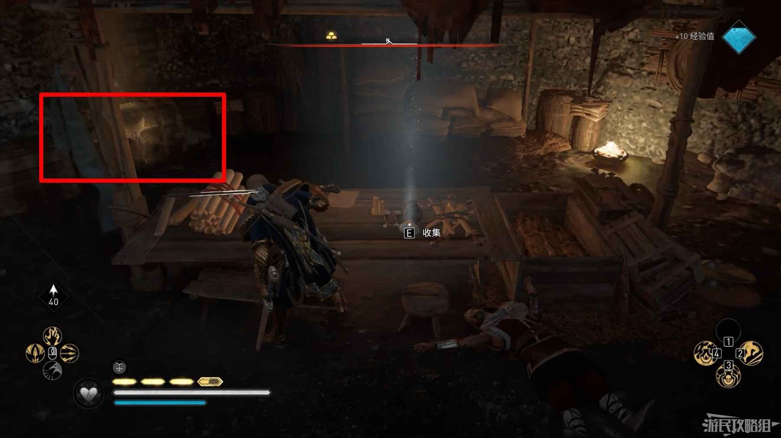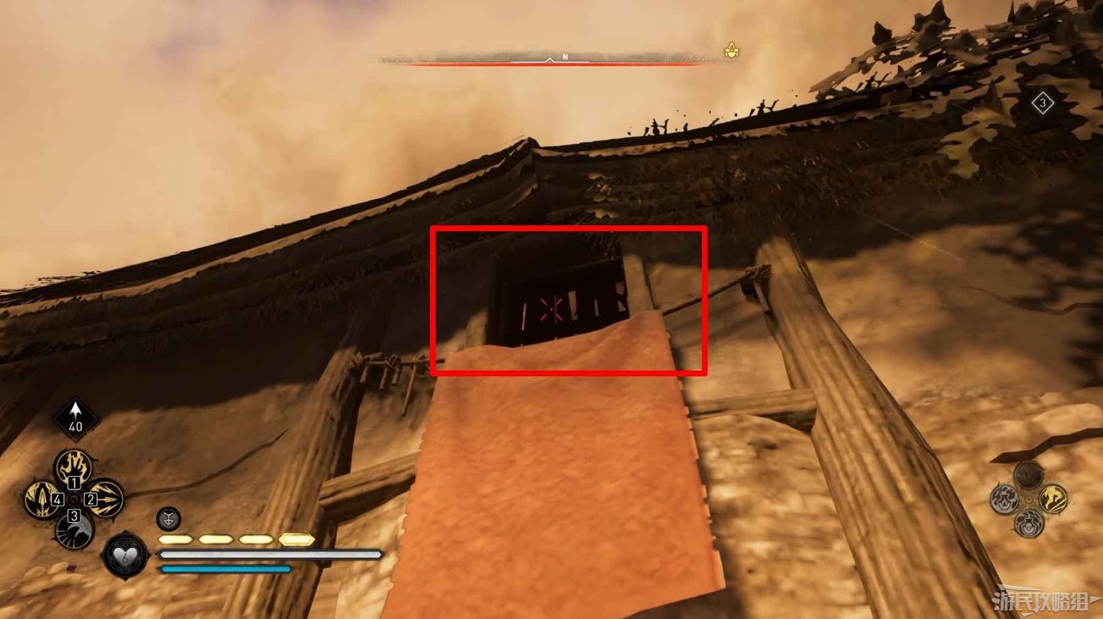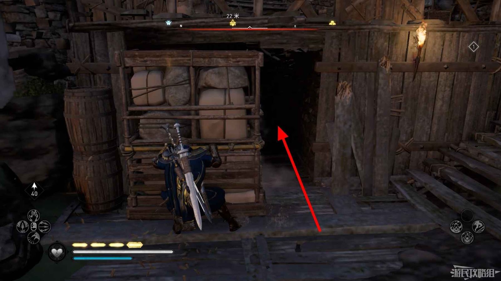 首先來到湖東側的小屋處,在小屋北面的牆上有一個缺口,通過缺口射擊箭矢可以破壞門閂。