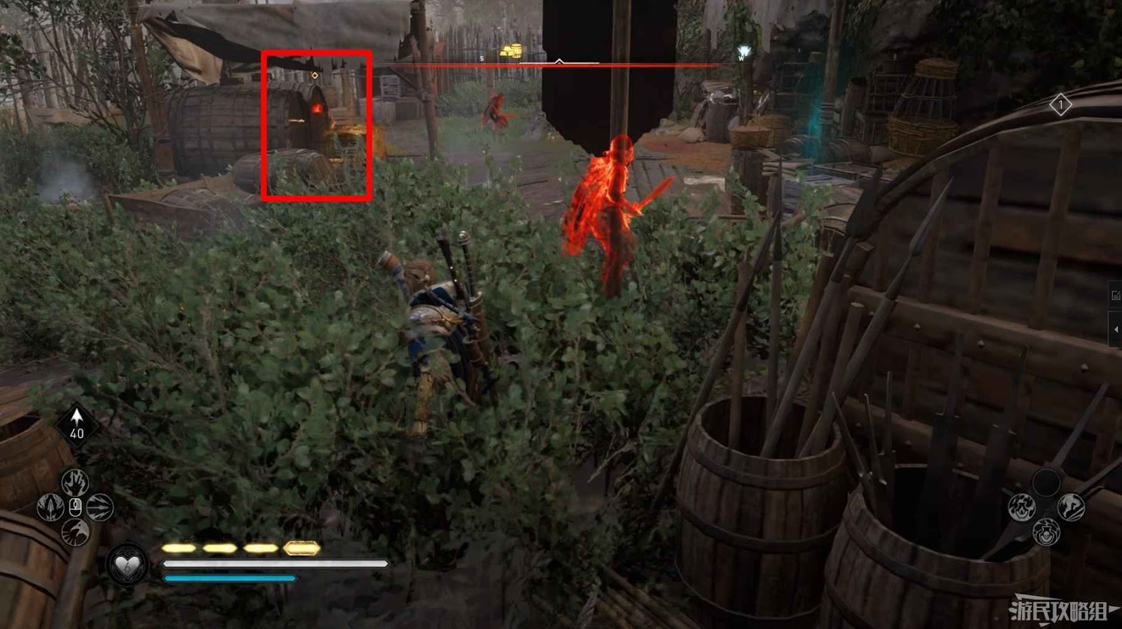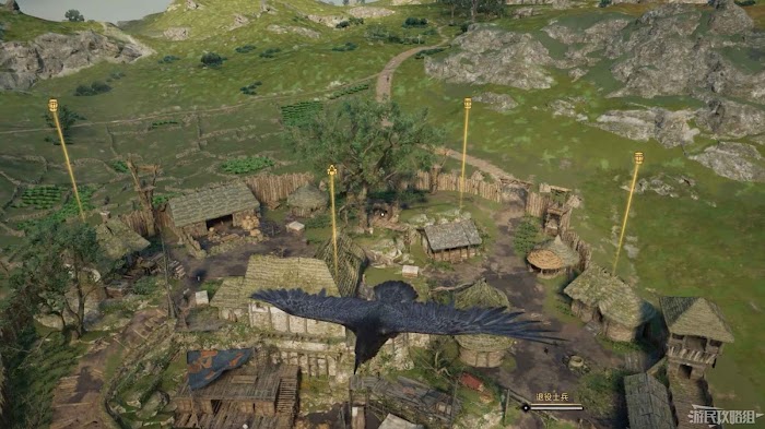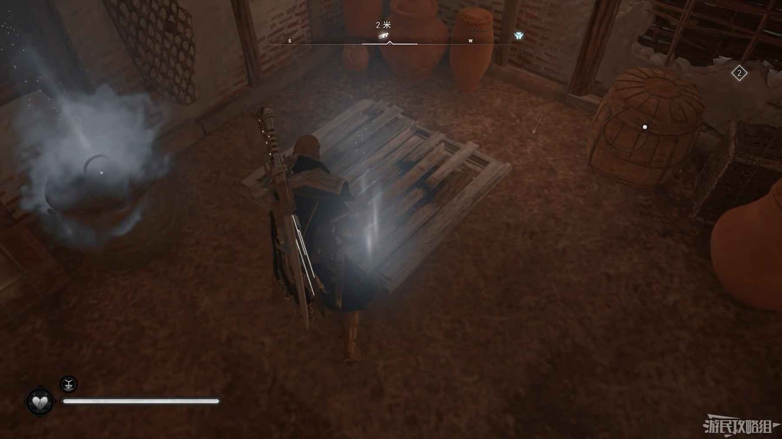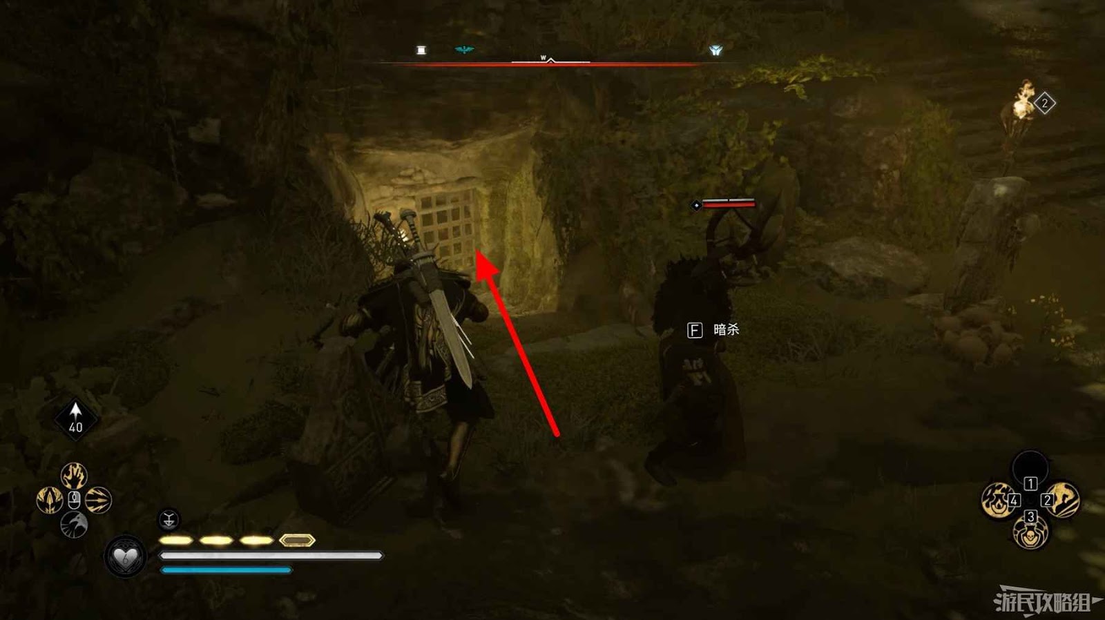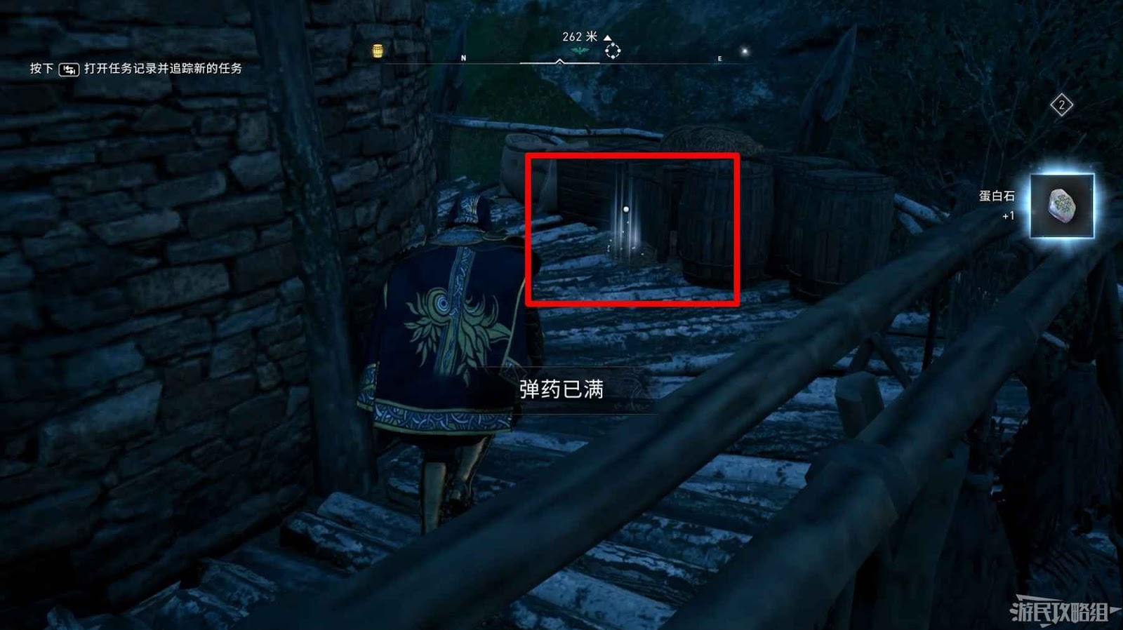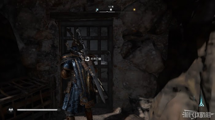 首先來到湖東側的小屋處,在小屋北面的牆上有一個缺口,通過缺口射擊箭矢可以破壞門閂。