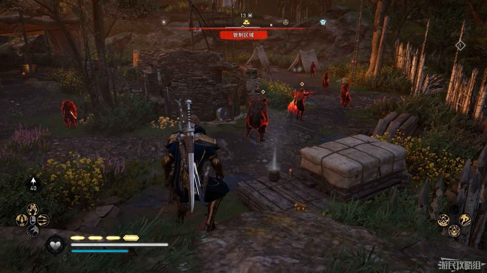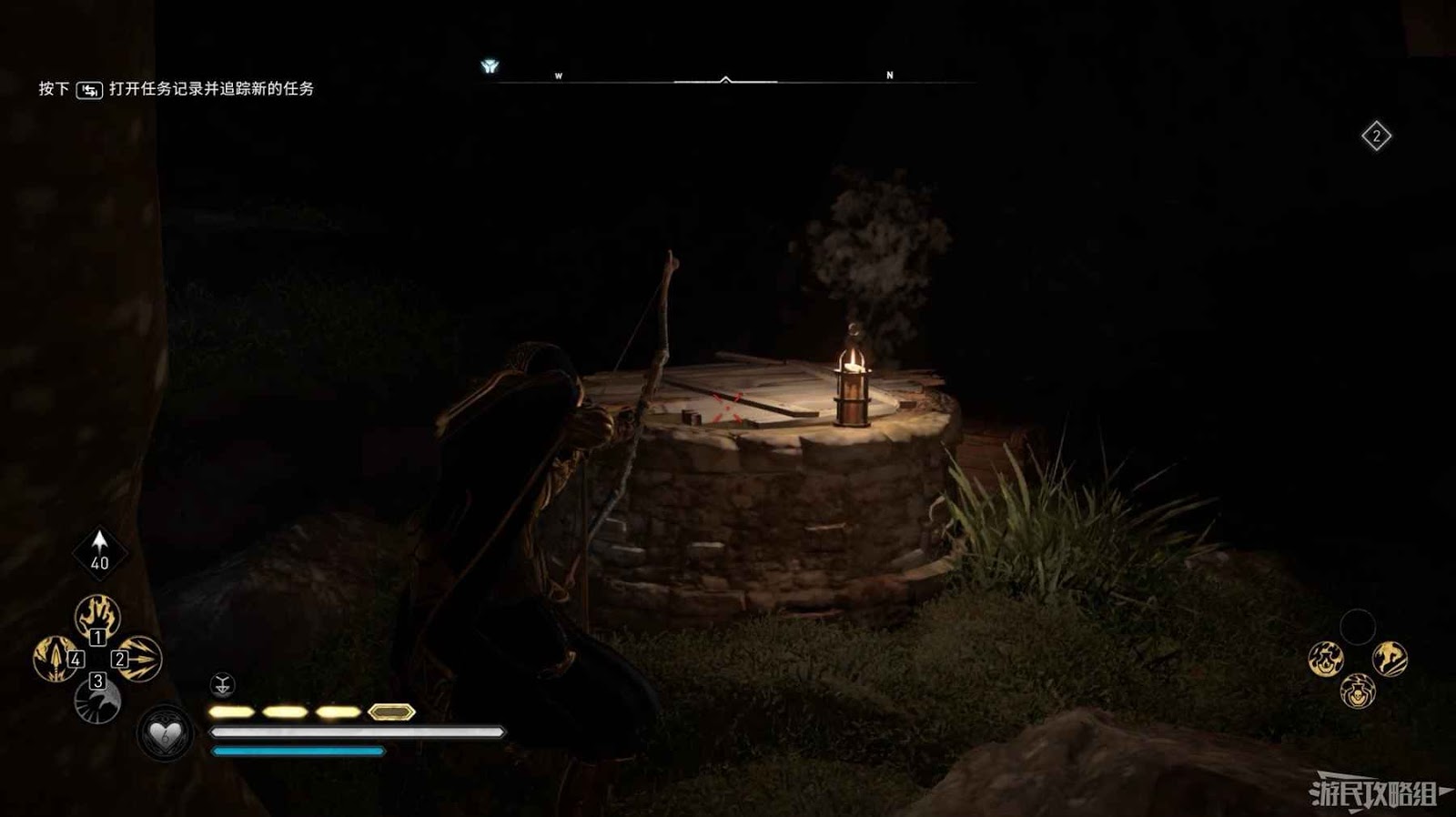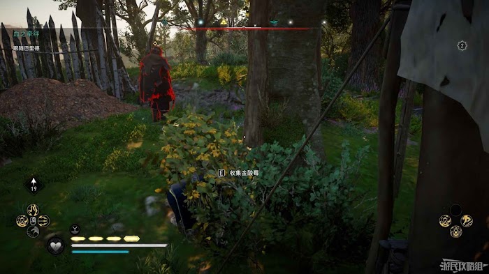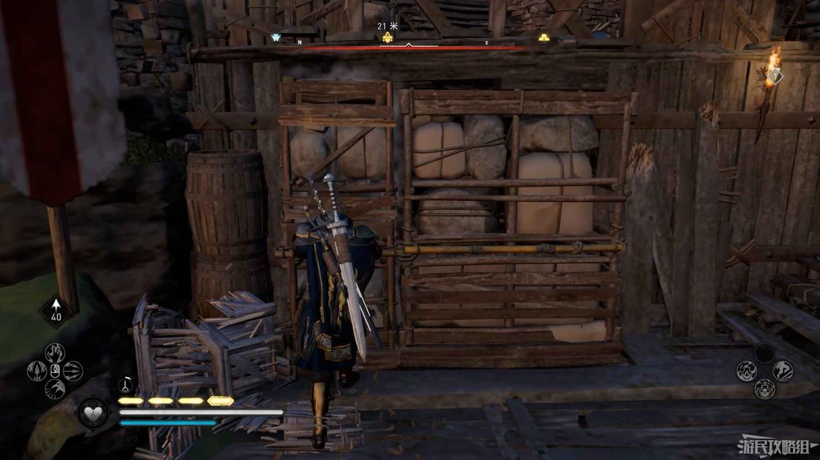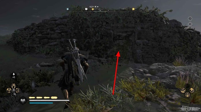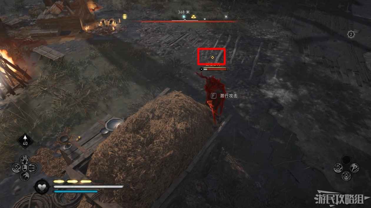 首先來到湖東側的小屋處,在小屋北面的牆上有一個缺口,通過缺口射擊箭矢可以破壞門閂。