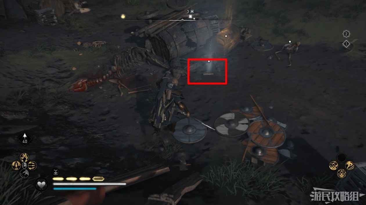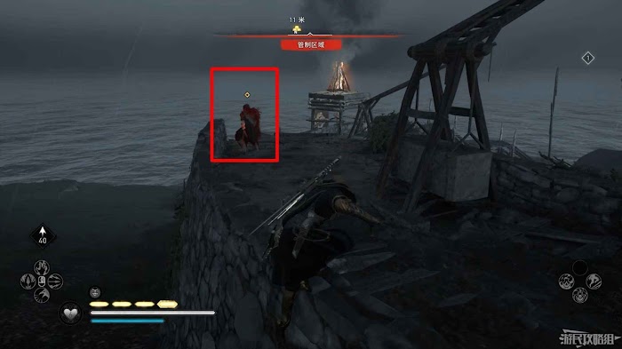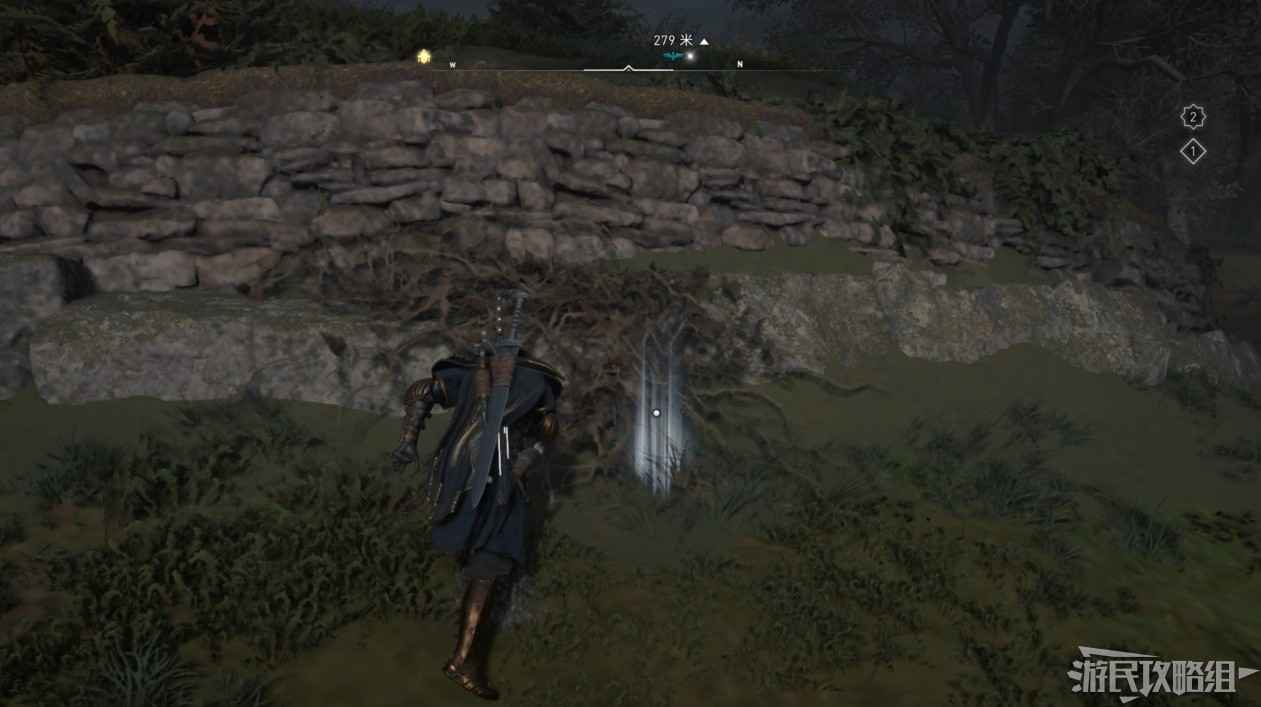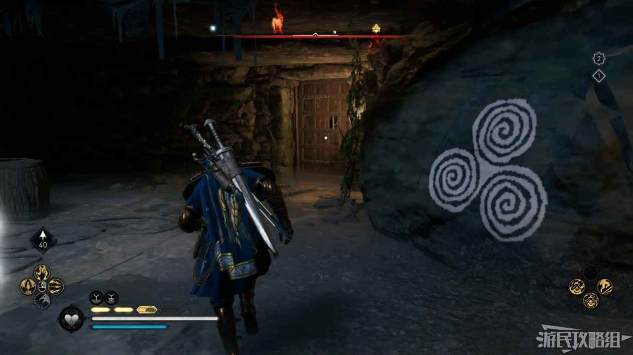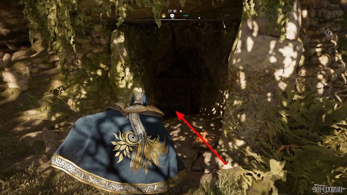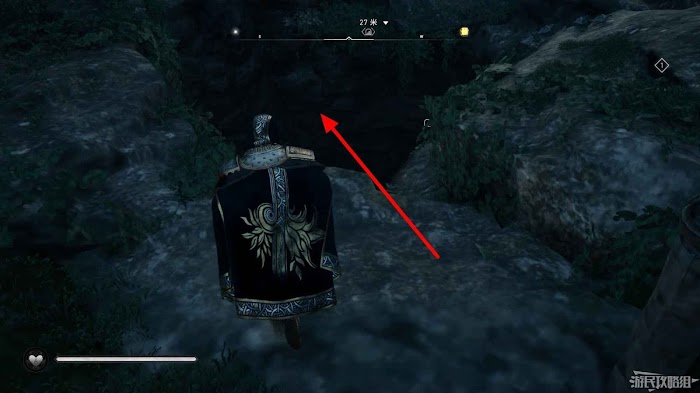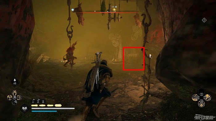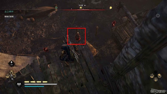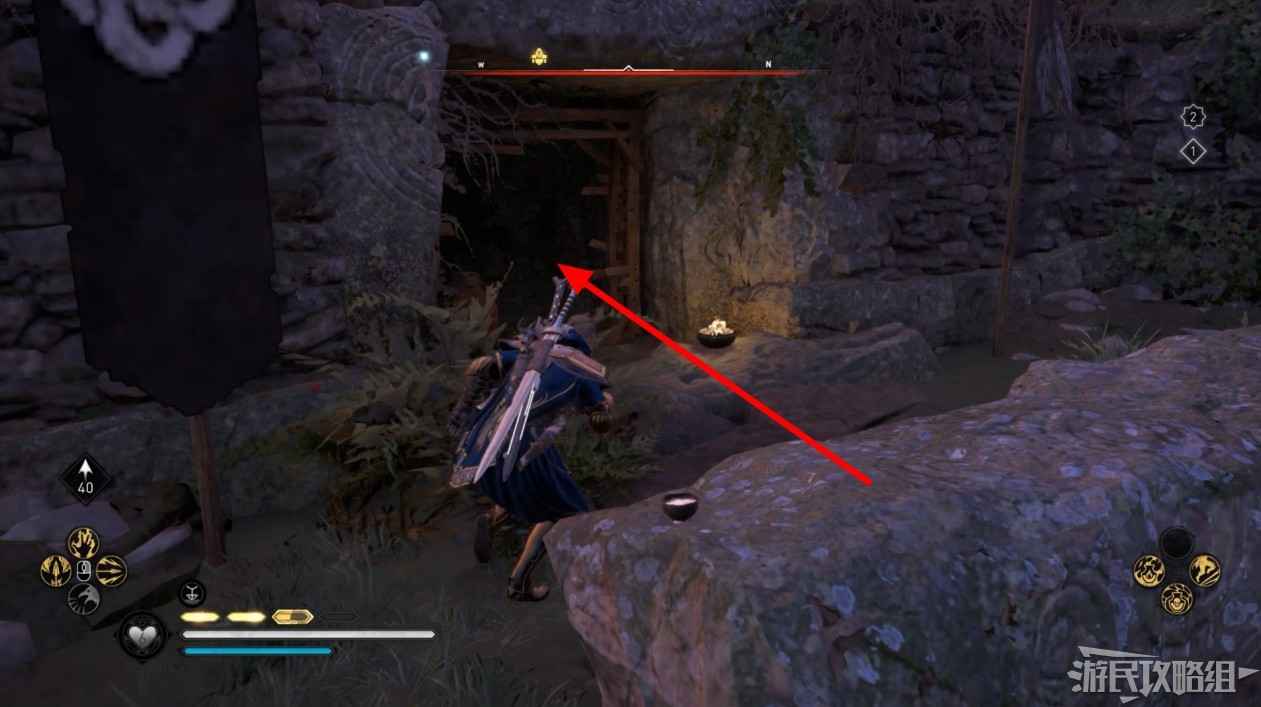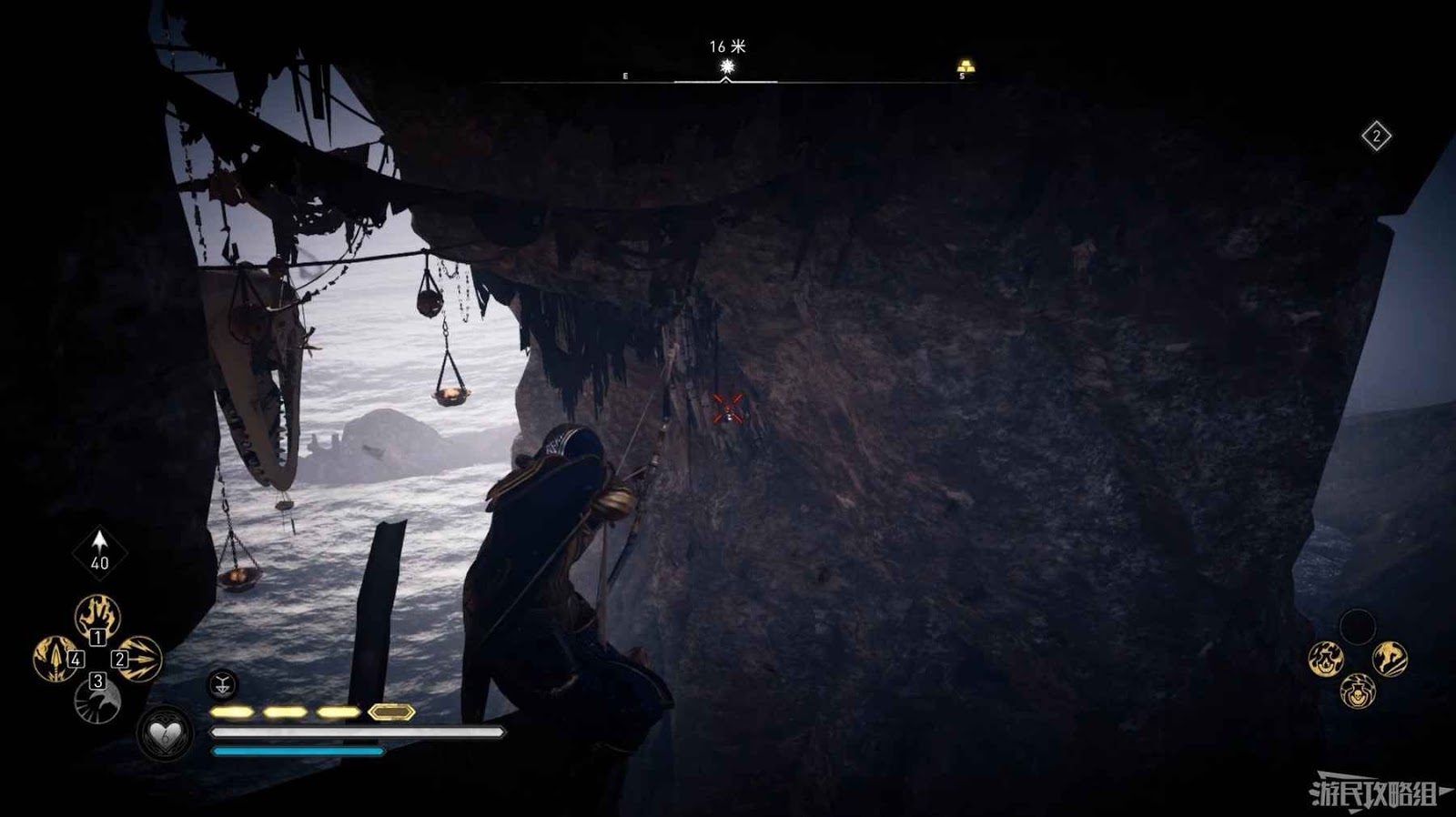 詛咒標記位於崖壁上的一個洞穴中,爬上另一側崖壁上的廢棄船隻處使用弓箭將詛咒標記破壞即可。